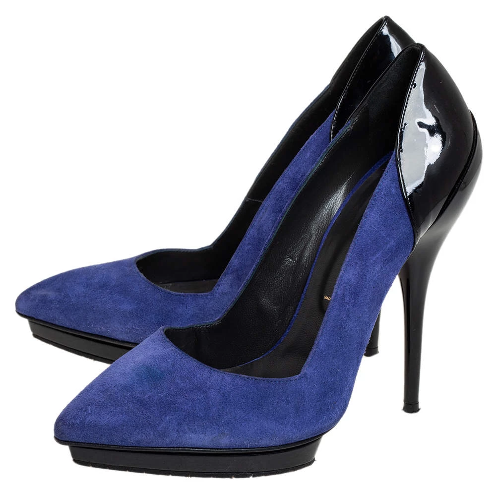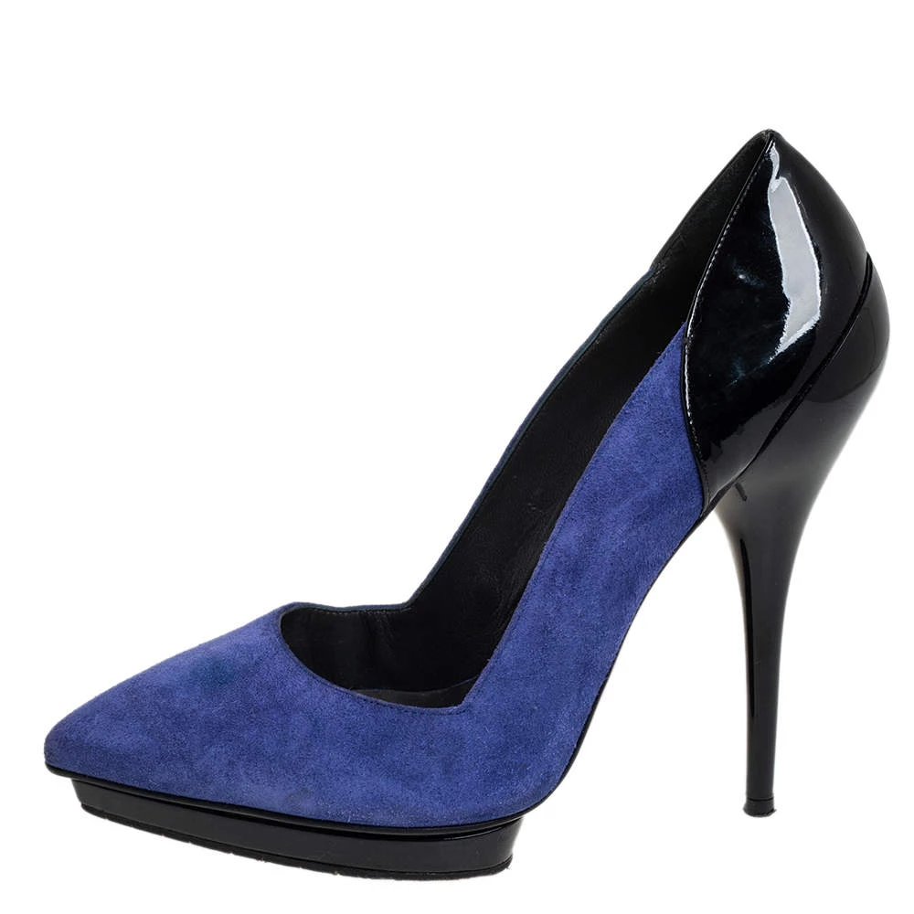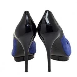Lend an uber-chic look to your ensemble in this pair of pumps, crafted meticulously from blue suede and black patent leather. This pair of Versace pumps adds a dramatic appeal to your entire look with its sharp pointed toes and high heels. Ideal for an event or a day out, this pair of pumps is amazing!