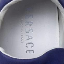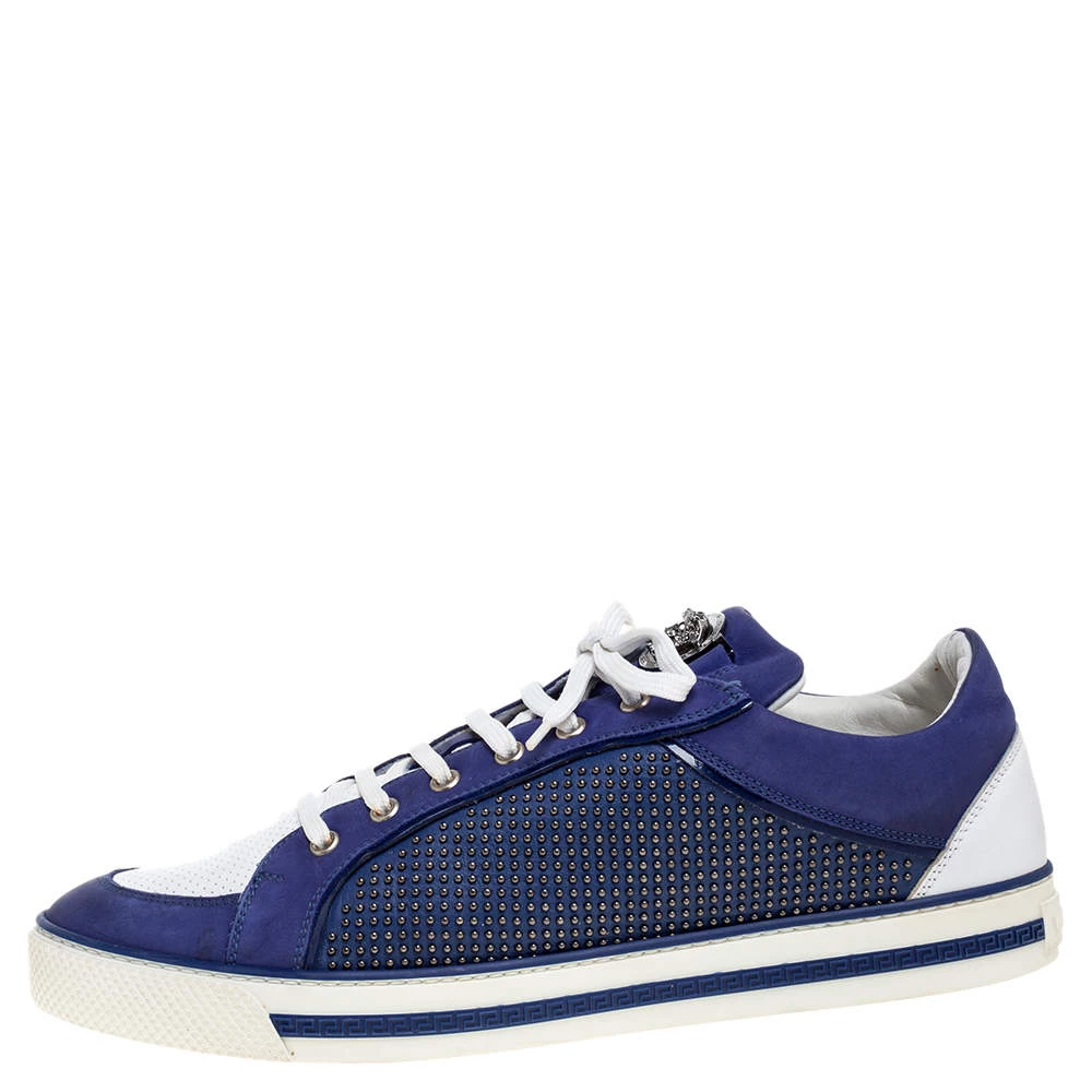 Made to provide comfort and exude a chic vibe, these low-top sneakers by Versace are trendy and stylish. They’ve been crafted from blue suede and designed with round toes, lace-ups on the vamps, multiple stud embellishments on the sides, and silver-tone Medusa logo detailed straps on the tongues. Wear them with your casual outfits for a sporty look dipped in luxury.