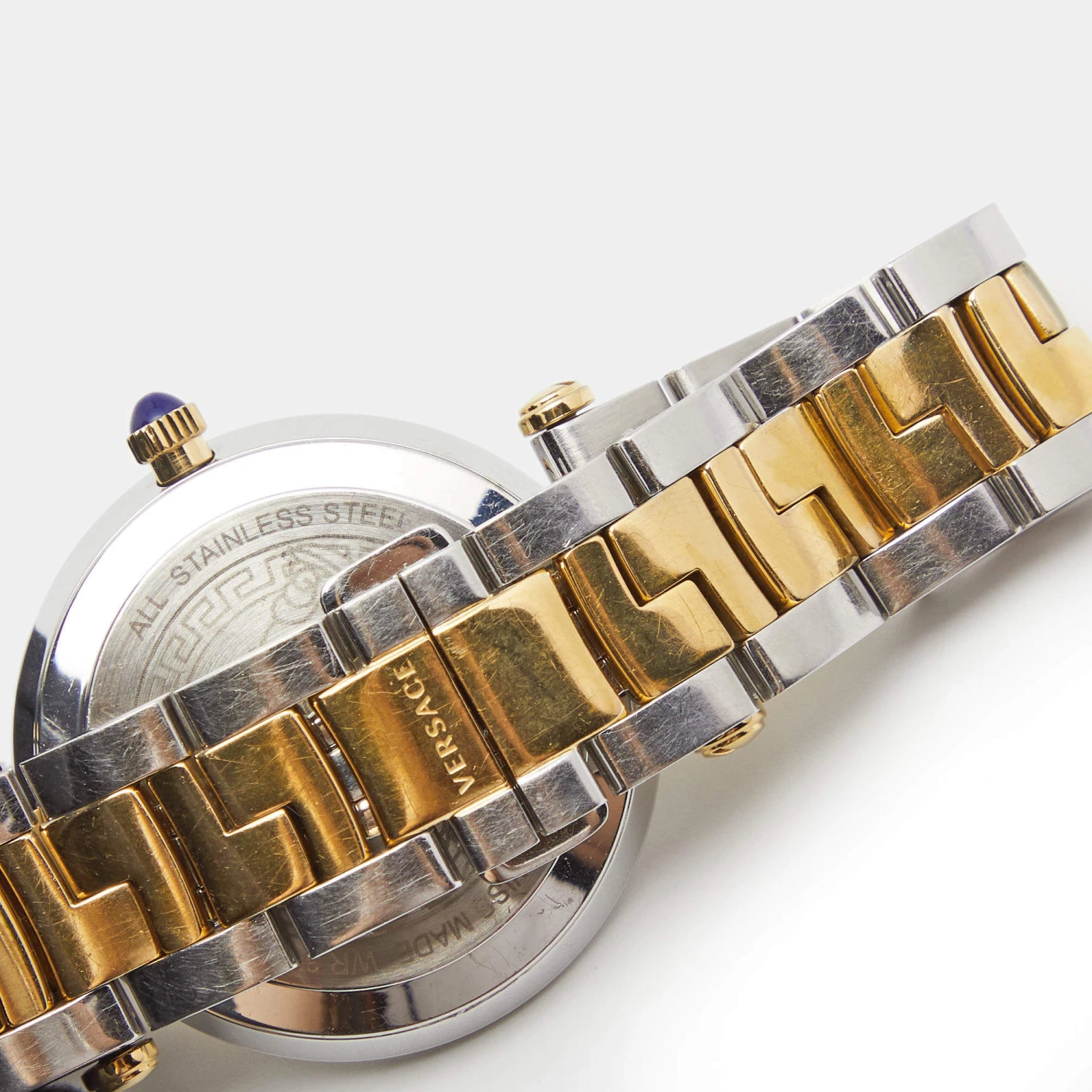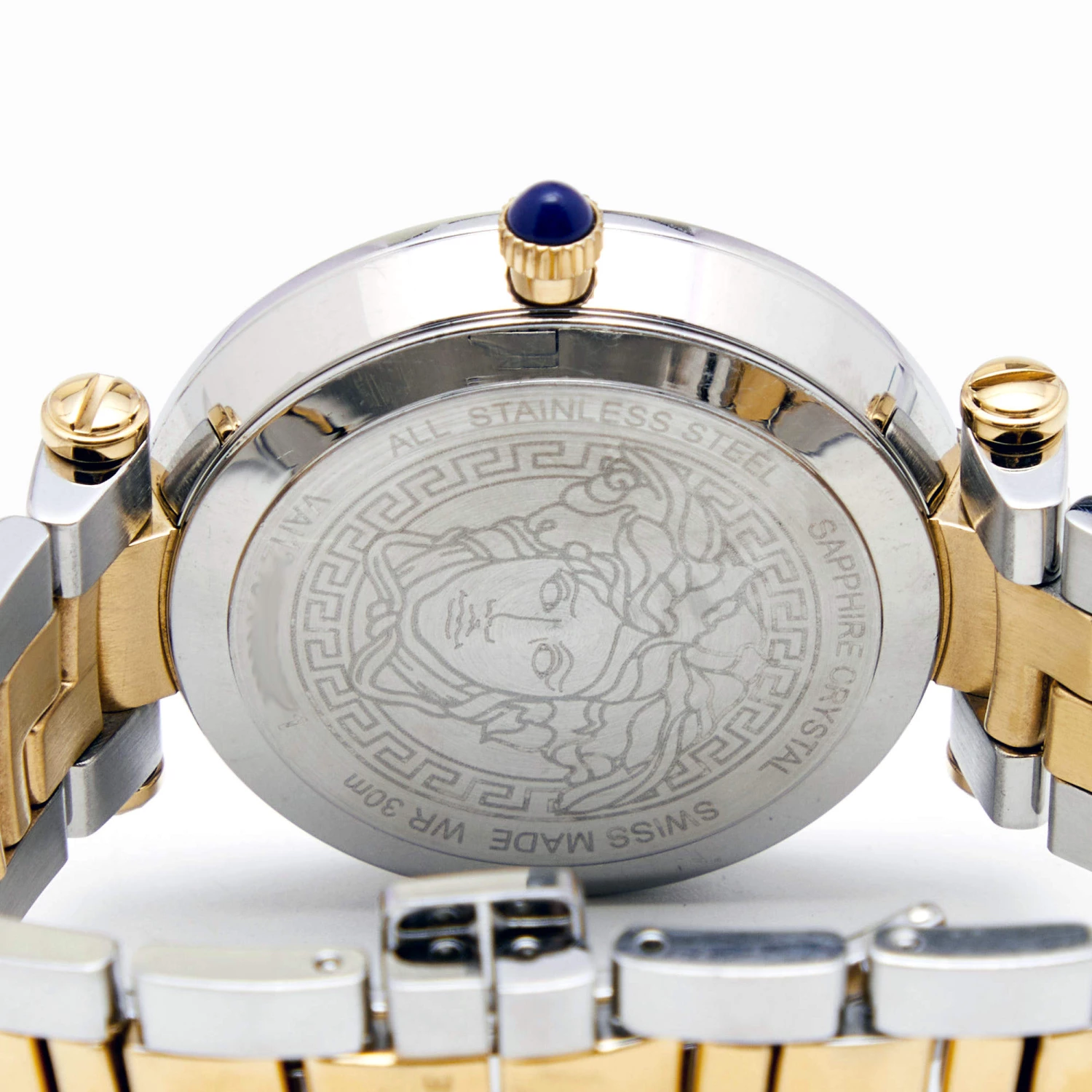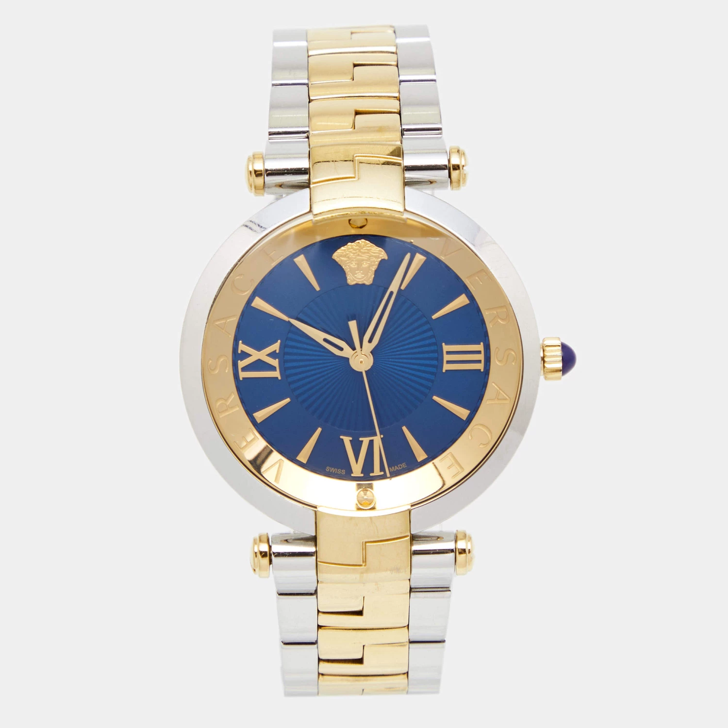 Let this timepiece by Versace help you make every moment count! The quartz watch is made using two-tone stainless steel and added with a blue dial. It is a functional accessory designed to impart a luxurious style while keeping you on time.