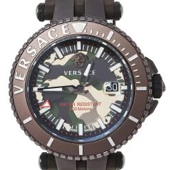 The Versace V-Race timepiece is a delight for watch lovers. Functioning on a quartz movement, the watch has an ion-plated stainless steel case with a diameter of 46 mm. While the bezel is detailed with the brand name, the camo dial boasts index hour markers, three hands, a date window, and the iconic Medusa logo. The case is neatly held by a rubber bracelet that fastens with a clasp fastening.