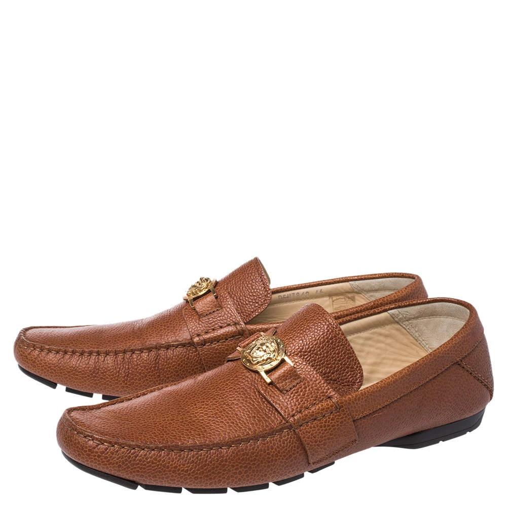 Precise stitching, use of quality leather, and a comfortable shape result in this pair of loafers. They are by Versace, and this is evidently displayed with the Medusa motif detailing on the uppers. The brown loafers are finished with gold-tone hardware and are wrapped in comfort and style.