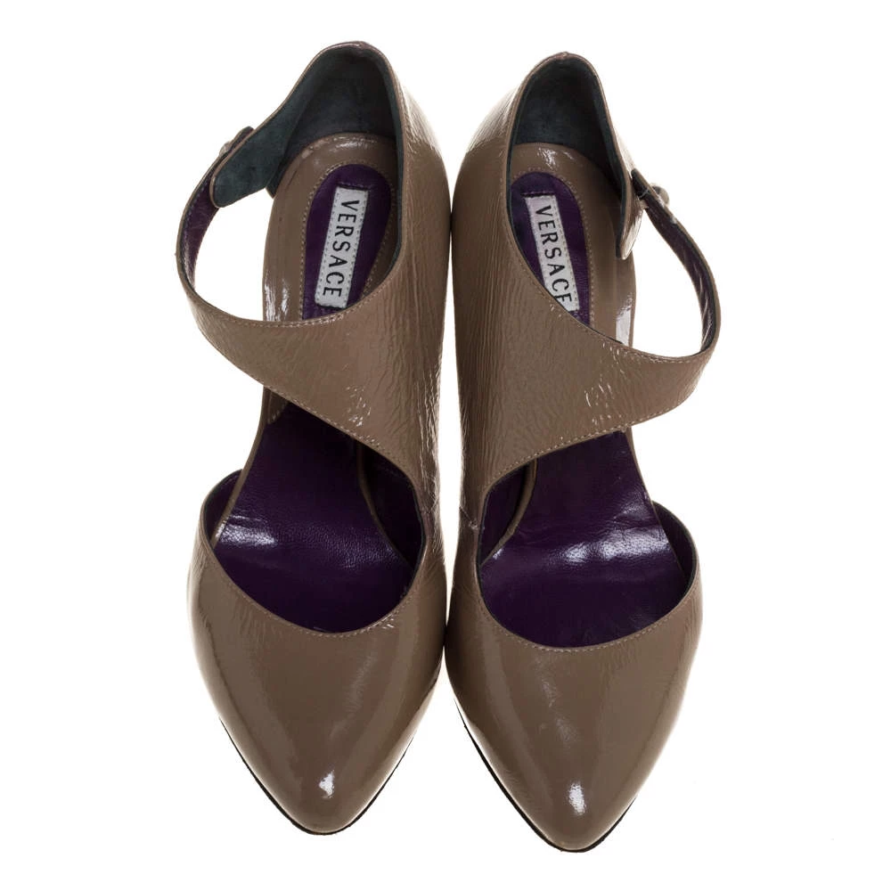 Crafted from brown patent leather, these pumps by Versace feature a half d’Orsay design. They bring pointed toes, button strap details, closed counters and 11 cm heels. The gorgeous pumps are constructed to provide both style and a stable lift.