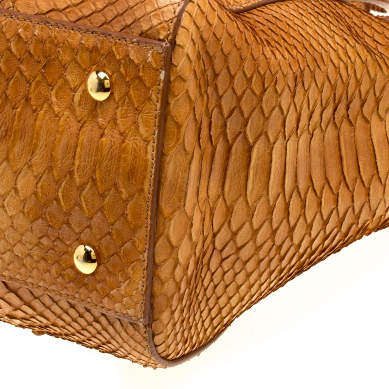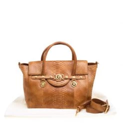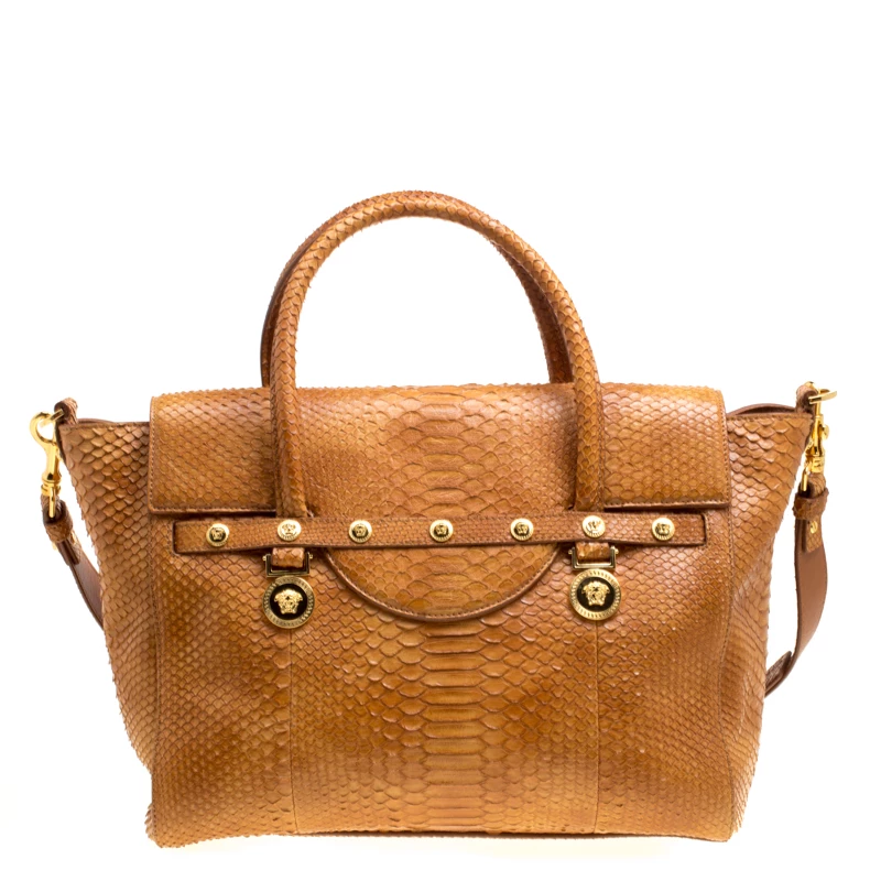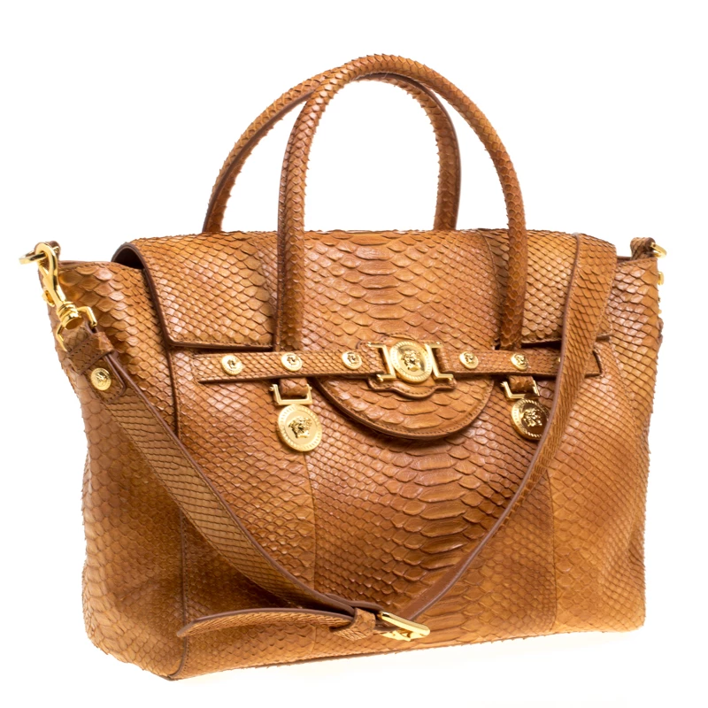 Sophisticated and luxe, this bag from Versace definitely needs to be on your wishlist. The bag is crafted from python in a lovely brown shade and it features a structured silhouette. It flaunts dual handles, a removable shoulder strap and the famous Medusa logo on the front. The spacious fabric interior houses three slip pockets.