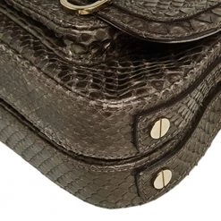 Make a striking appearance with this fashionable shoulder bag by Versace. This elegant creation is at once a fashion statement as well as a rational necessity. It is crafted from python leather and is adorned with gold-tone metal accents. Lined with satin, it has a spacious interior where you can stow your basics. This pretty piece is complete with a shoulder strap.