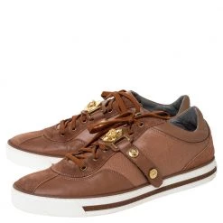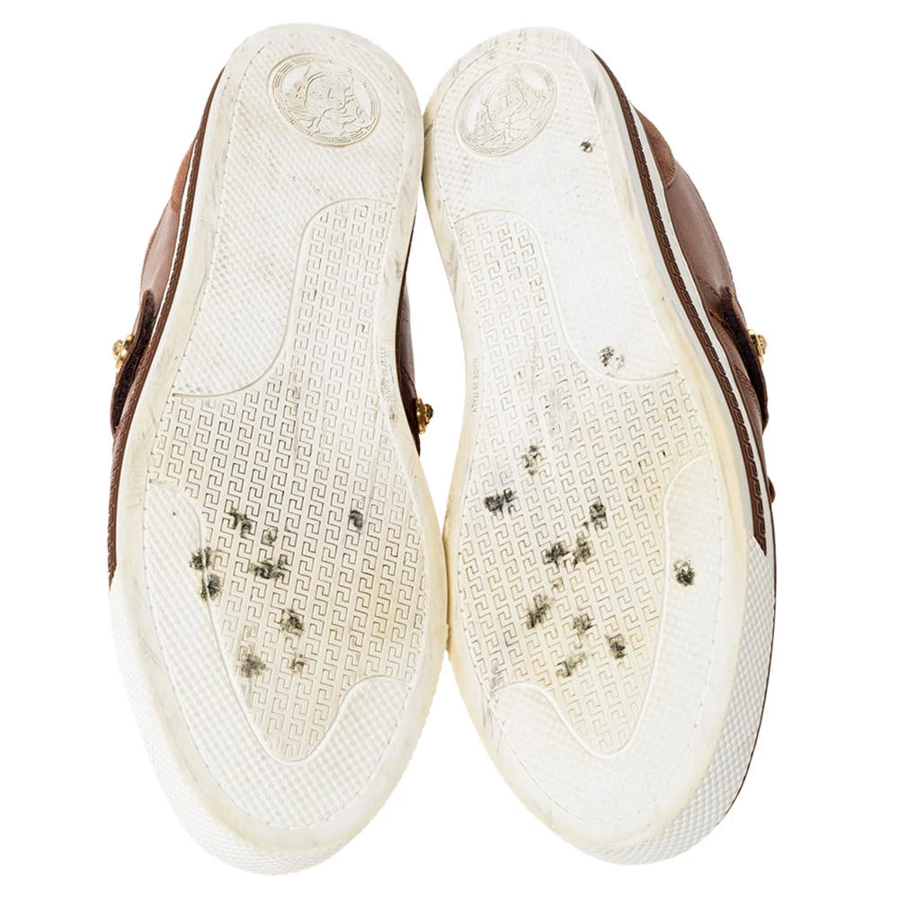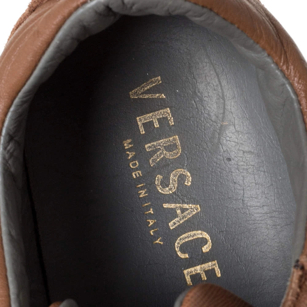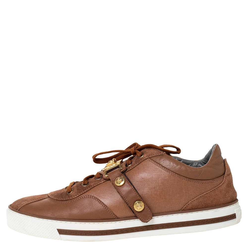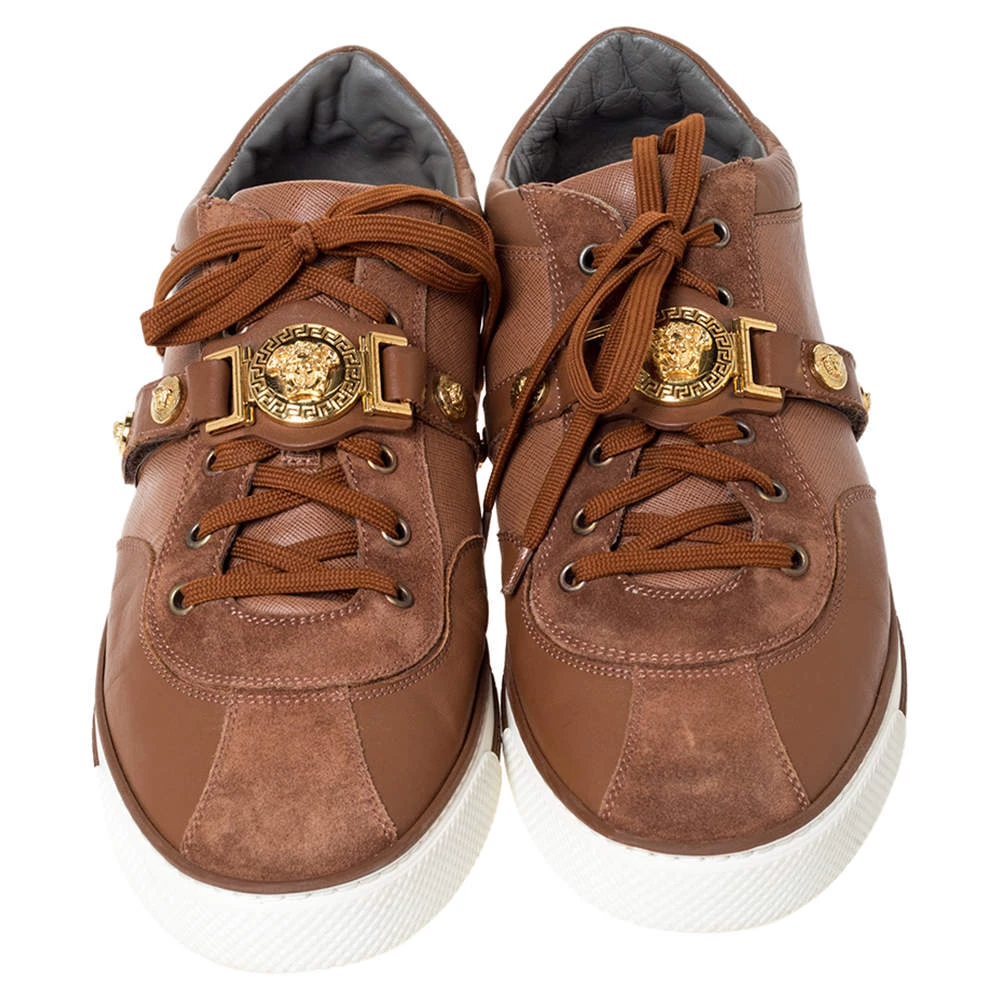 These suede and leather sneakers are meant to lend a luxe twist to your outfit. Looking fashionable in your casuals is as easy as slipping into these brown sneakers. Designed by Versace, they feature the Medusa detail, lace-up vamps and rubber soles.