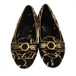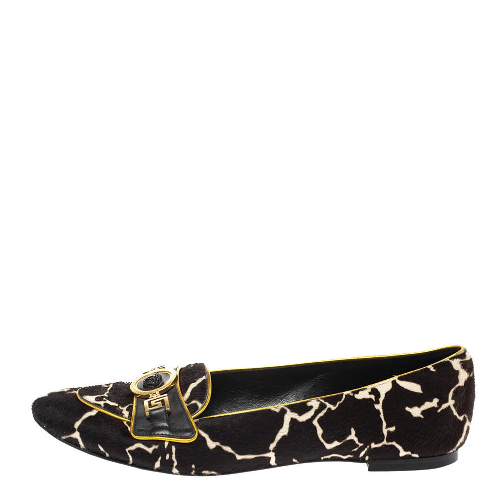 These Versace leopard-print calfhair and leather flats are made to bring effortless style to you. They are designed with round toes, signature motifs on the uppers and durable soles. Comfortable and well-made, these flats can be worn with casuals.