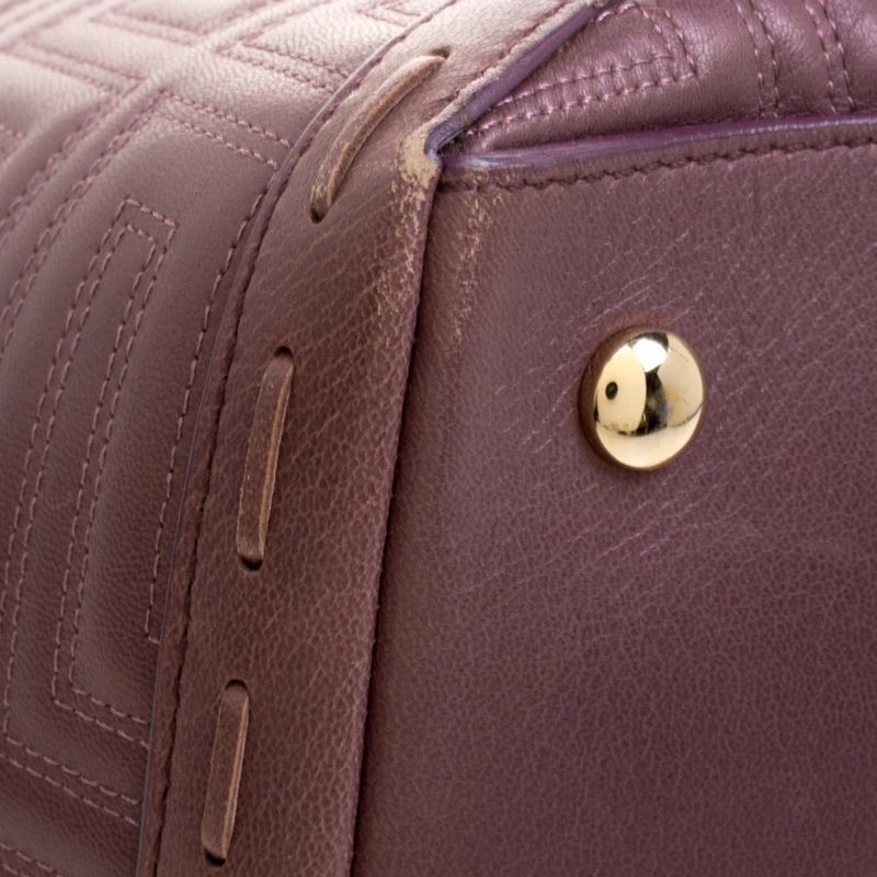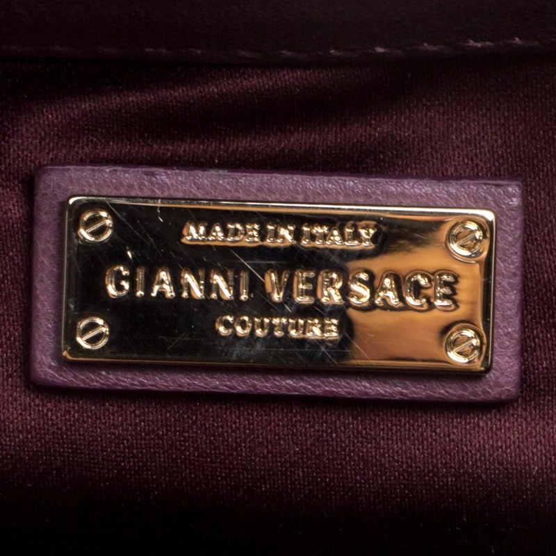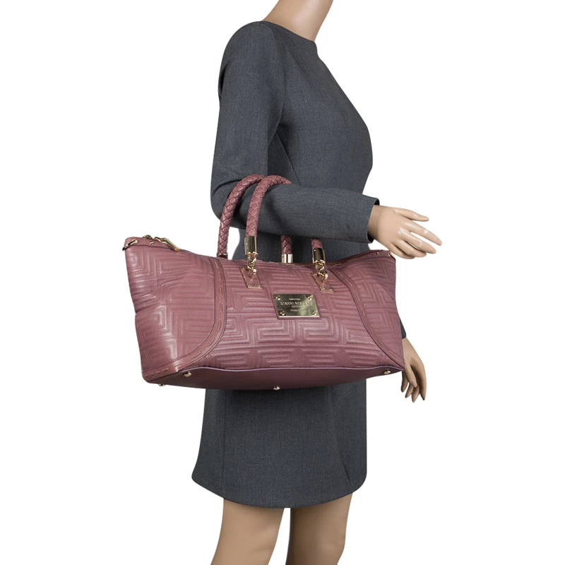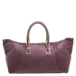 An absolute delight, this satchel is a Versace creation. It has been crafted from embossed leather and enhanced with gold tone hardware. The bag comes with a dark beige exterior that flaunts the brand label while being held by two braided handles. It is complete with protective metal feet and a spacious satin lined interior.