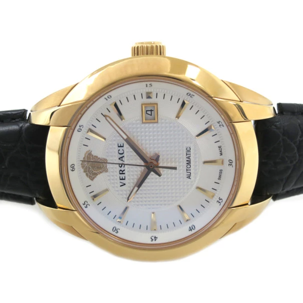 This Versace Charcter Wristwatch for men is simply stunning. The round white textured dial hosts gold bars, a date window and a Versace logo representing the head of Medusa. The gold plated case showcases an exhibition case back. The quality leather black strap fastens on the wrist with a fold over clasp mechanism. This water resistant timepiece will accentuate your presence in every ceremonial event.Gender: MenOriginal Retail Price: USD $2,200Condition: NewCase Size: 42 MMBand material: LeatherBand Size: 14.5-19.5 CMMovement: AutomaticCase material: Gold PlatedIncludes: Original Box, Case, Guarantee Card, Manual Book, Original Dust Bag