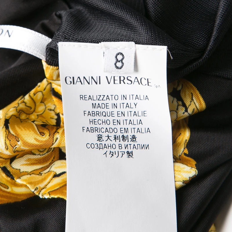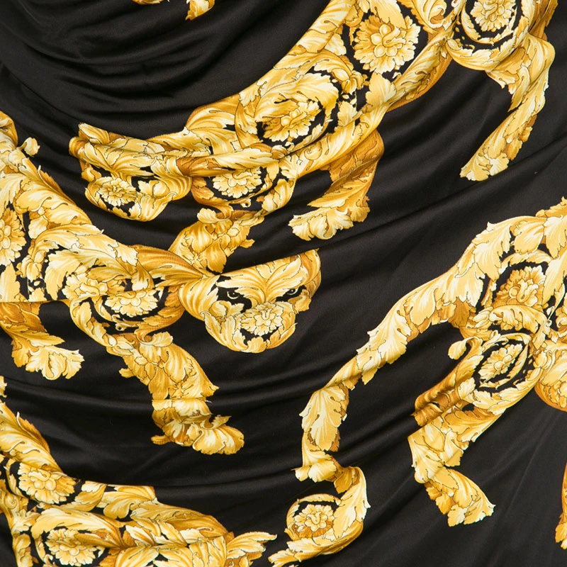 Lovely, isn’t it? This dress by Versace Collection is so beautiful, you’ll look high-fashion every time you slip into it. Keeping their famous signature of gold through the cat prints, the sleeveless dress is made complete with drape details. A glossy pair of black sandals will look great with this creation.