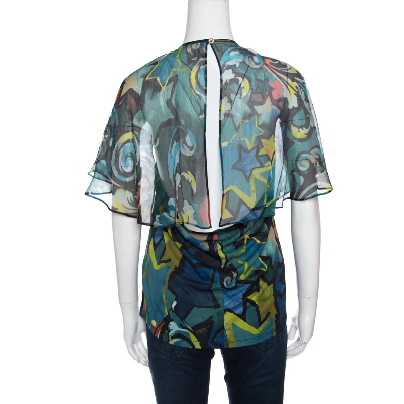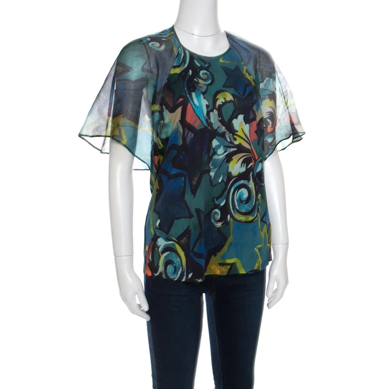 Versace has always been synonmous with chic, sophisticated and powerful dressing and proving it just right is this stylish halter top. The top is made of a blend of fabrics and features a multicolour printed pattern all over it. Flaunting a cape style, it displays a round neckline, short sleeves and a button loop closure at the back. Pair it with denims and ballet flats for a fashionable outing.