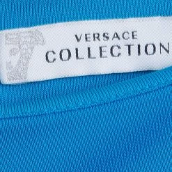 Versace Collection delivers a sophisticated take on femininity with this turquoise blue dress. Crafted from 100% viscose, it has a round neckline, flared sleeves, and comes with a gathered detail at the front for a flattering silhouette. The dress is fastened with a rear zip closure.