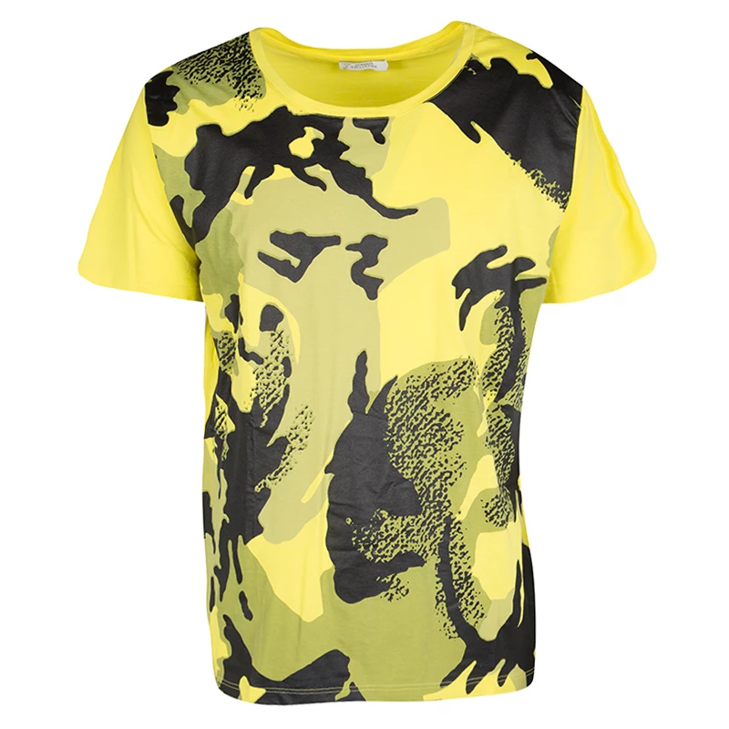 Wild hunk casual Yellow Camouflage Print short Sleeve Cotton t-shirt from the House of versace, with creative and trendy graphics, the print quality is as smooth as it can’t be felt with closed eyes hand touch, The fit is long and can be worn in casual daily wear use, 100% cotton fabric is used which is long lasting, and very soothing to wear in hot summer days.