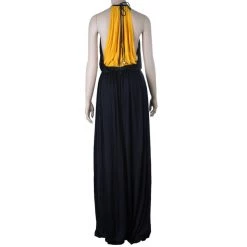 We are loving the latest color-block trend and specifically this Versace evening dress. Crafted from a viscose and polyester blend, this black dress features orange block of color down its middle, subtle pleated detailing and a halter neck.