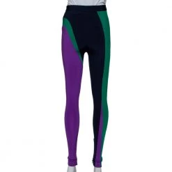 Exhibiting a relaxed silhouette, these color block knit leggings from Versace are visually appealing and highly comfortable. They have been designed with a front zip closure and will look good with simple tops and flat slides for lounging around in style.