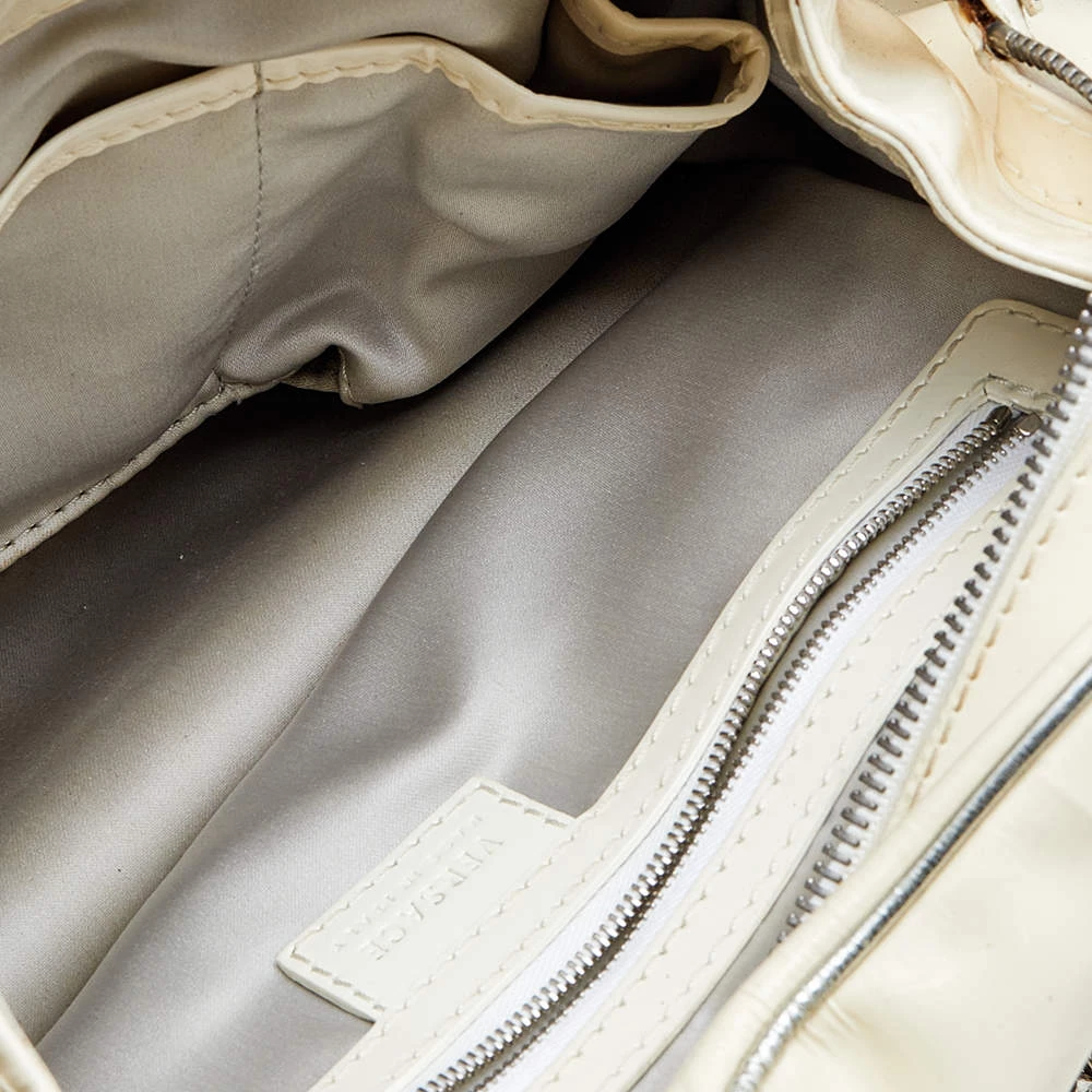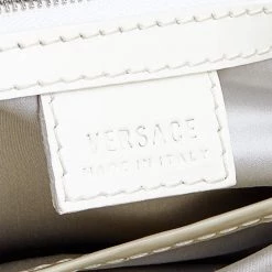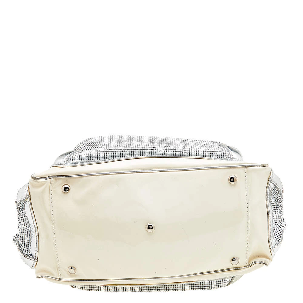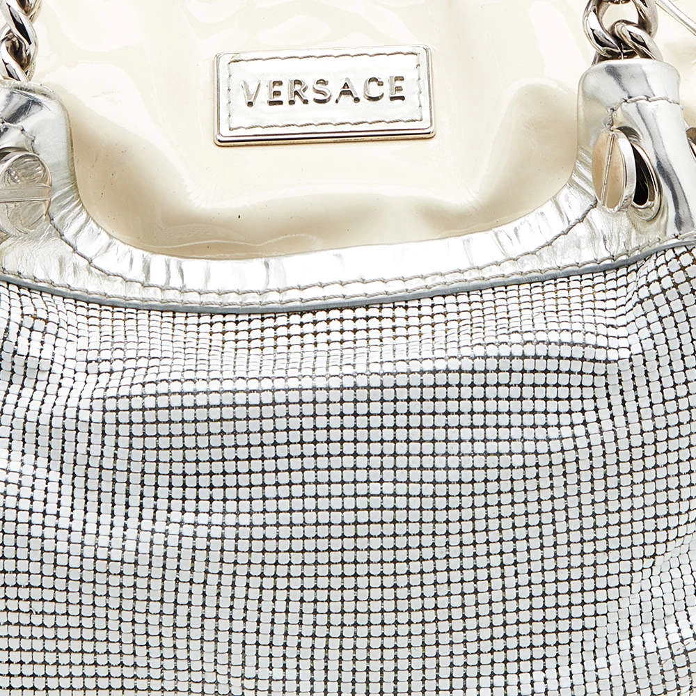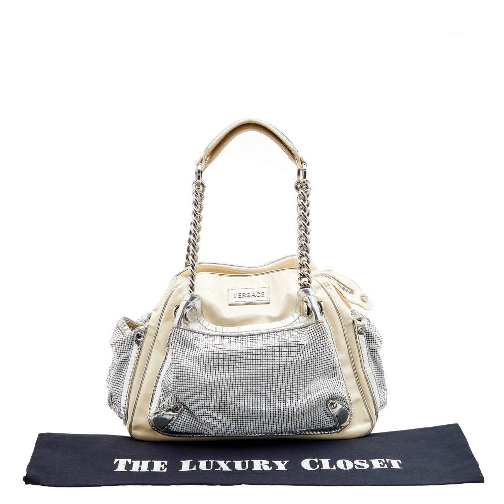 Versace handbags are known for their unique designs that emanate the label’s feminine verve and immaculate craftsmanship so that they last season after season. Crafted from cream patent leather, the satchel is elevated with metallic mesh and the brand plaque at the front.
