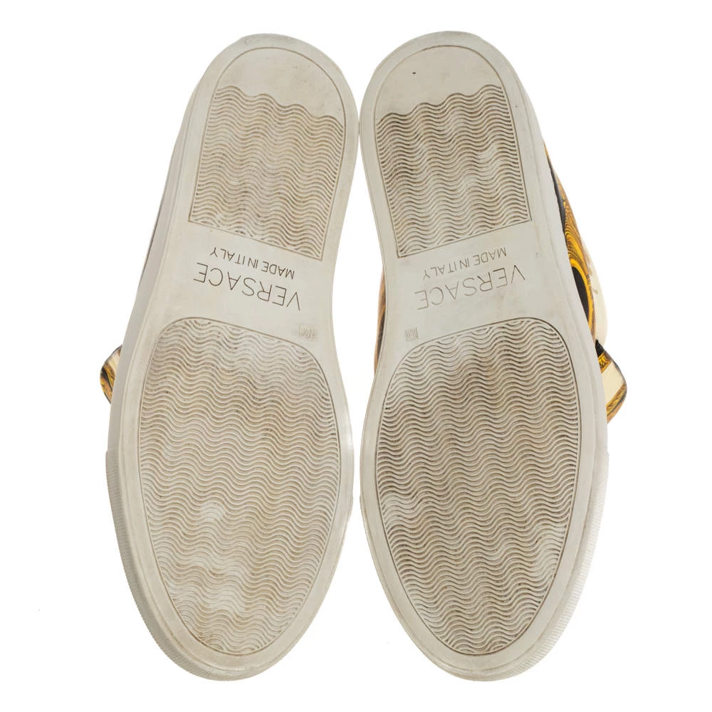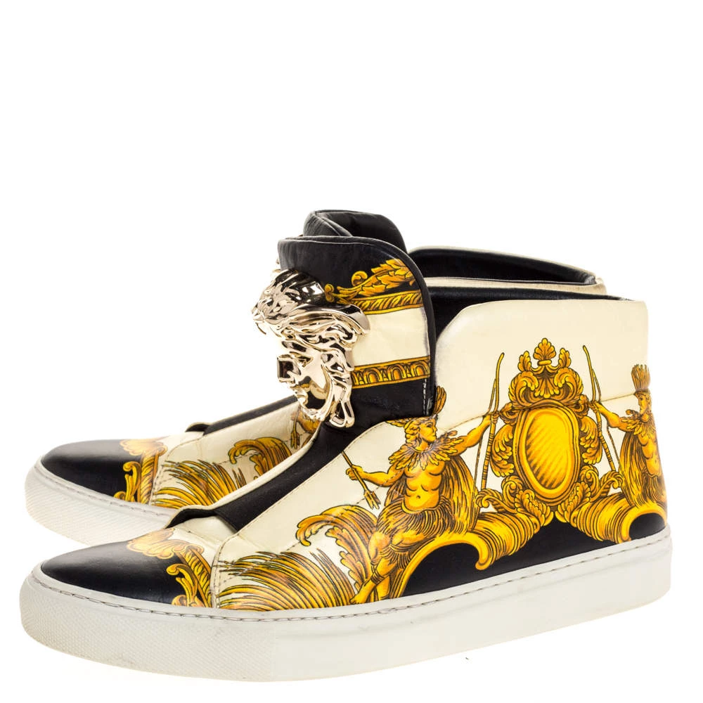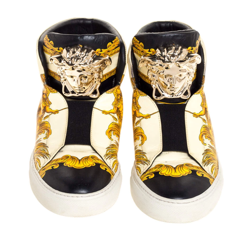 Sneakers are sought-after for reasons like comfort, ease and casual style. These Versace ones fit right in as they are stylish and snug. They come crafted from printed leather into a slip-on silhouette with the Medusa logo on the front.