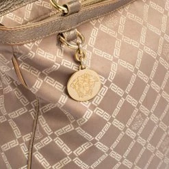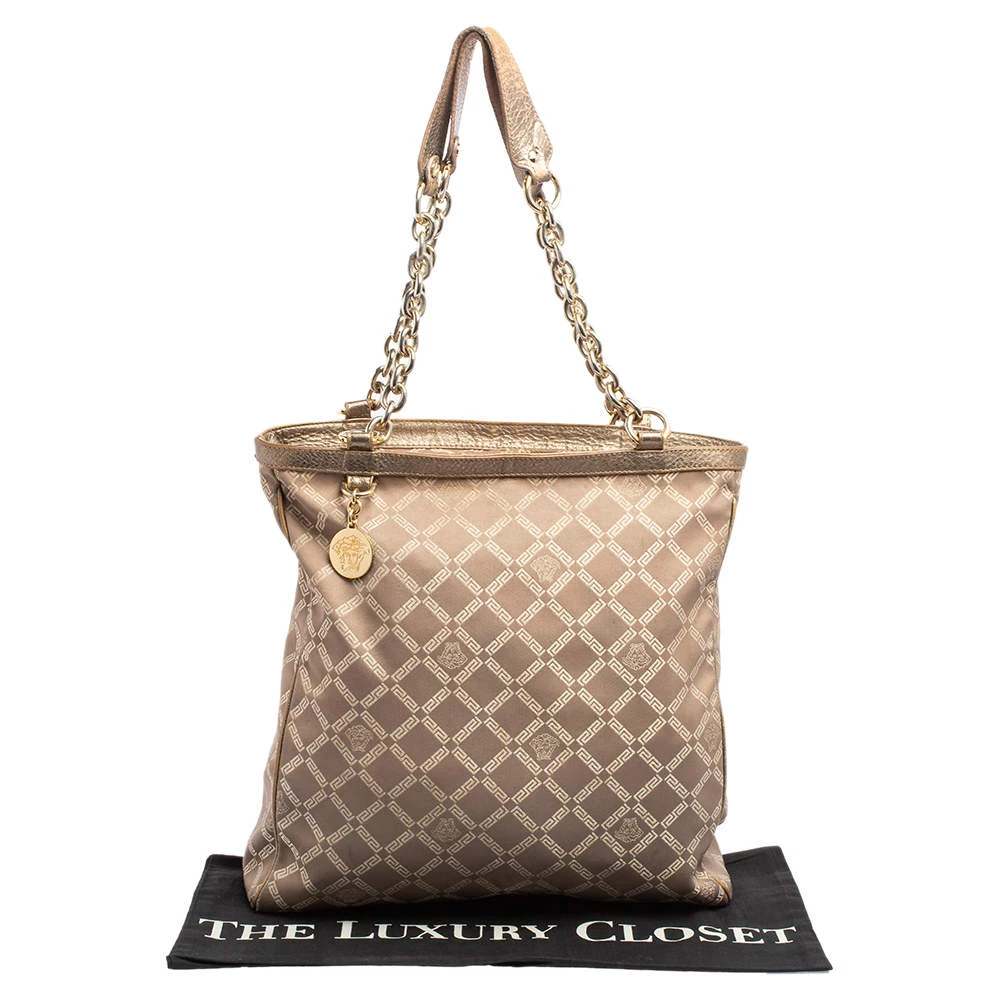 Add a touch of glamour to your attire with this attractive Versace tote. It flaunts the signature fabric and leather exterior and is perfectly completed with gold-toned fittings. This chain tote by Versace is great for daily use and will complement your outfit well.