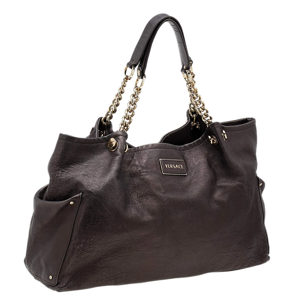 This Versace tote is a simple and elegant accessory. From its design to its structure, the leather bag delivers charm and function. It flaunts chainlink handles for you to swing and a satin interior to hold all your essentials.