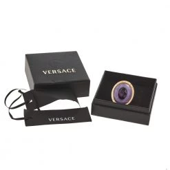 This dreamy cocktail ring by Versace has a crystal mounted on a gold-tone band. The size and deep color of the surrounding enamel, the signature engravings, and the clean lines add to the beauty of this splendid creation. Make it yours today!
