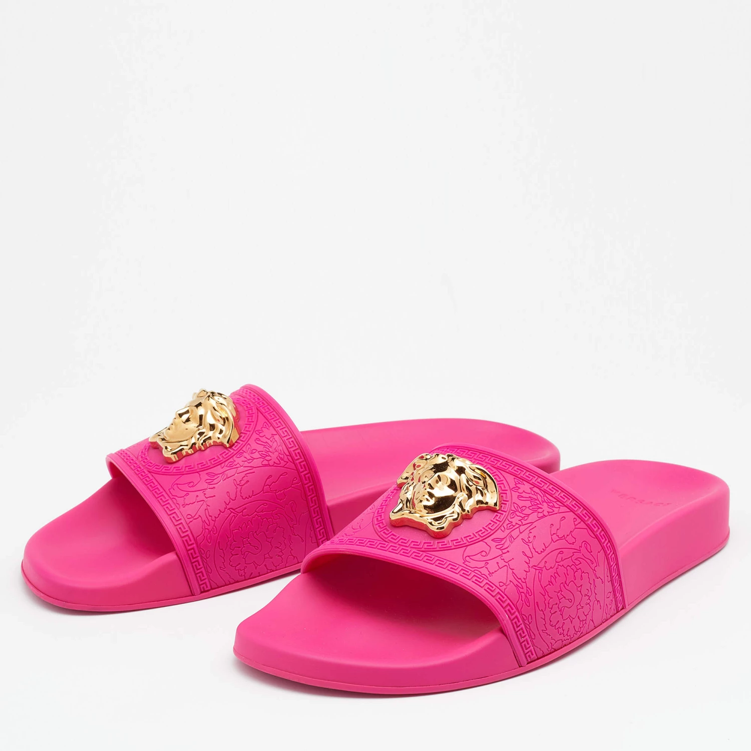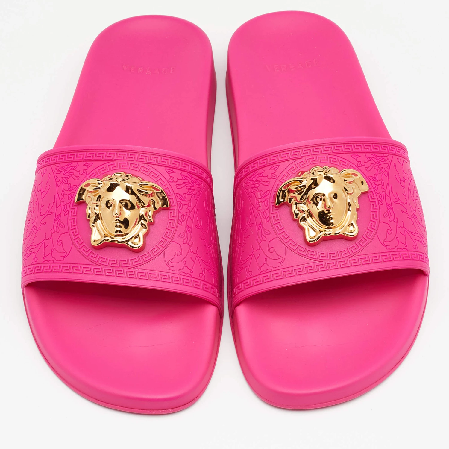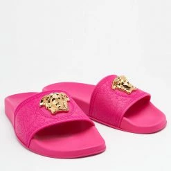 Versace understands your need for comfort and style in these slides. The flats are crafted in Italy and made from water-resistant rubber. They are styled with open toes, broad front straps with the Medusa logo for a signature finish.
