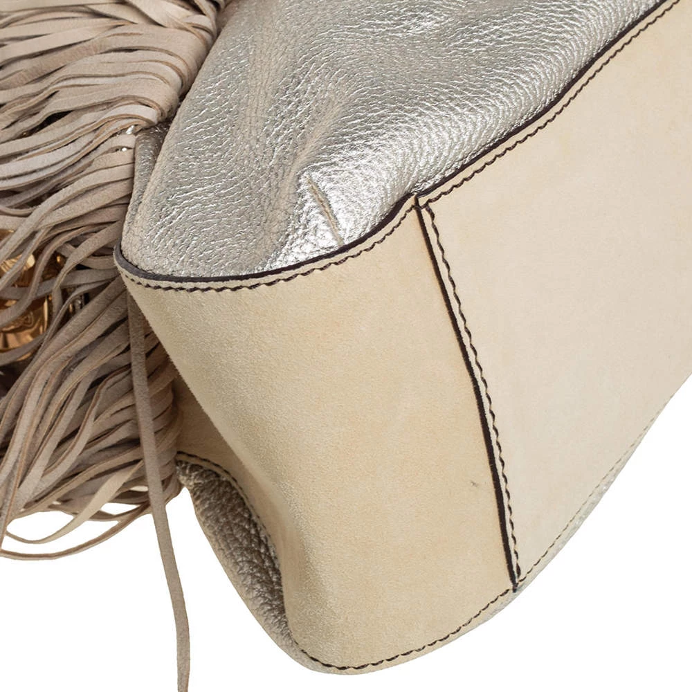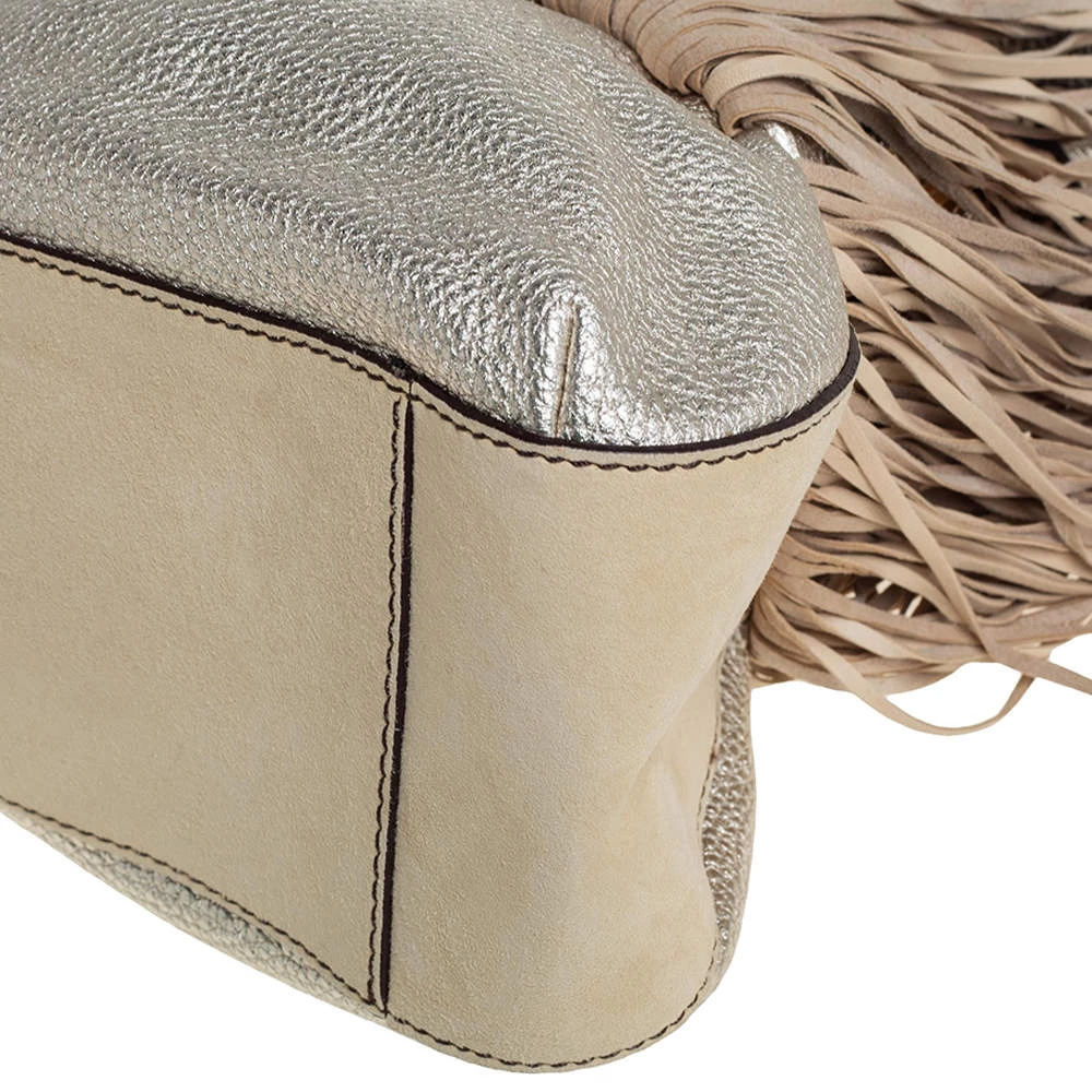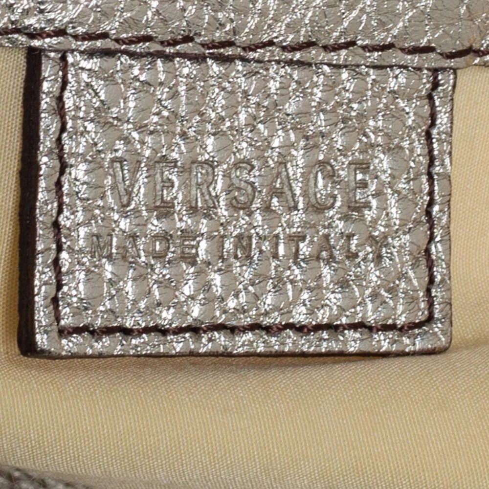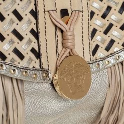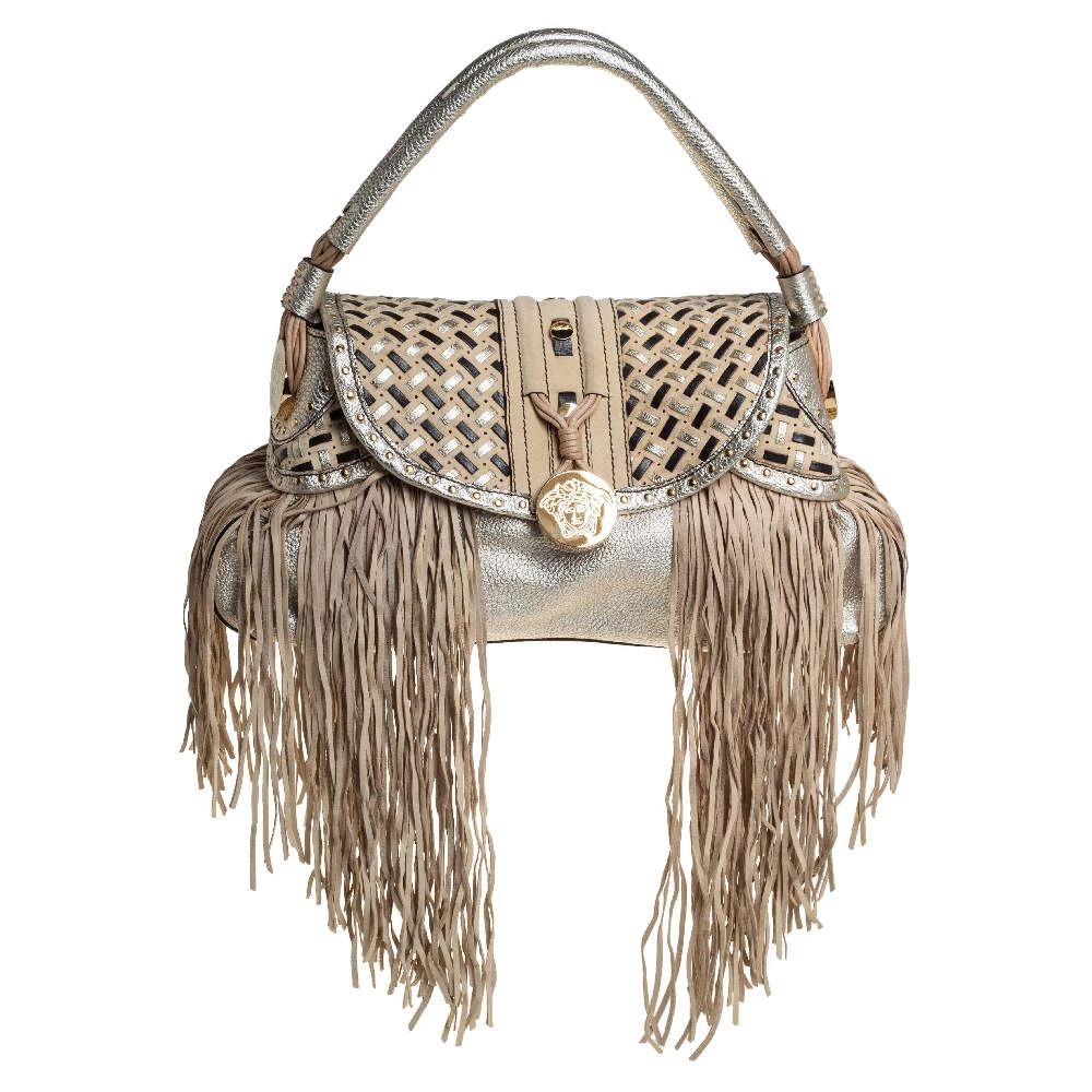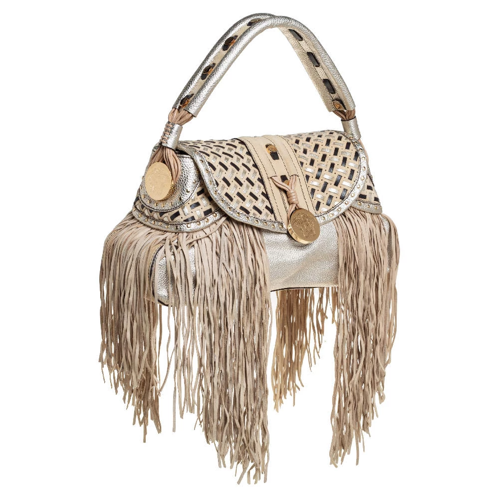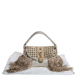 When utility meets high style, we get this Versace bag. Crafted from woven leather, this bag features a top handle, the Medusa logo charm on the embellished front flap, heavy fringes on the exterior, and a satin interior to house the things you need.