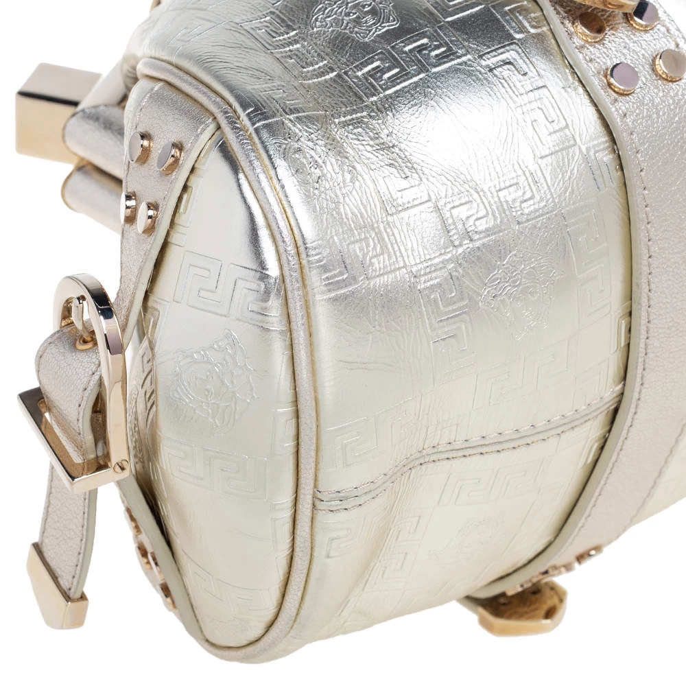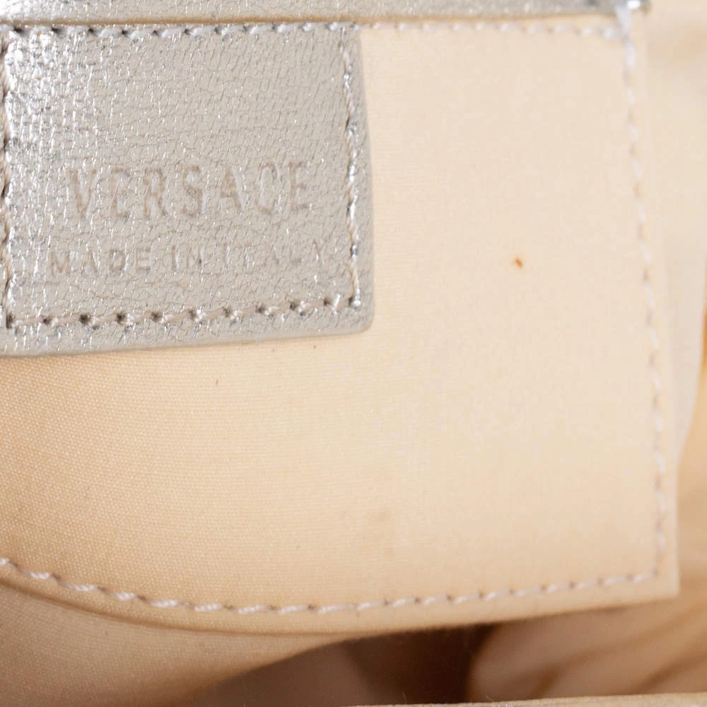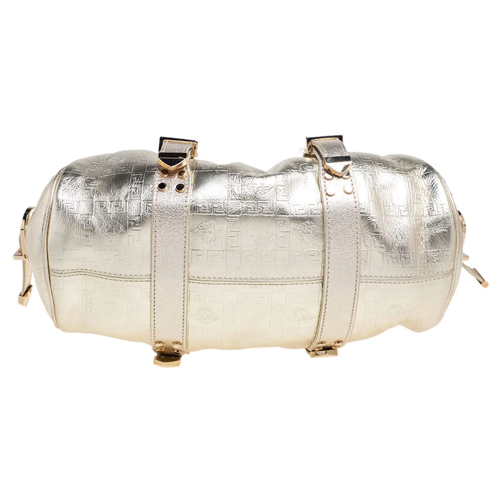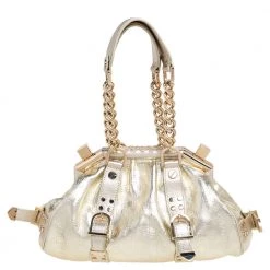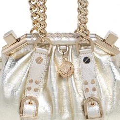 The Madonna satchel from Versace is crafted from gold-hued leather and enhanced with matching gold-tone hardware. It comes with thick, chained handles and a logo charm on the front. The stunning creation is lined with satin on the inside and will easily hold your necessities with oodles of style!