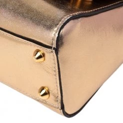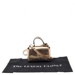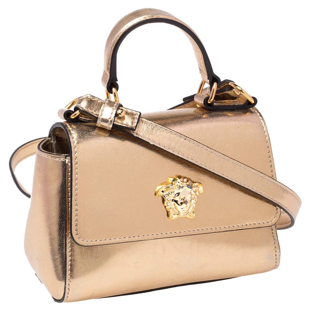 Comfortable and easy to carry, this Versace leather bag comes in metallic gold with the Medusa emblem on the front. It has a shoulder strap, a top handle, and an interior lined with fabric to keep your essentials organized and safe.