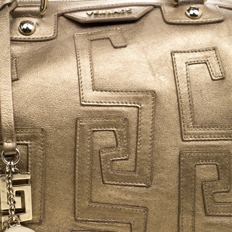 Spacious and captivating, this Boston bag is from Versace. It has been crafted from leather and equipped with a spacious satin interior, two rolled handles and a dangling charm.
