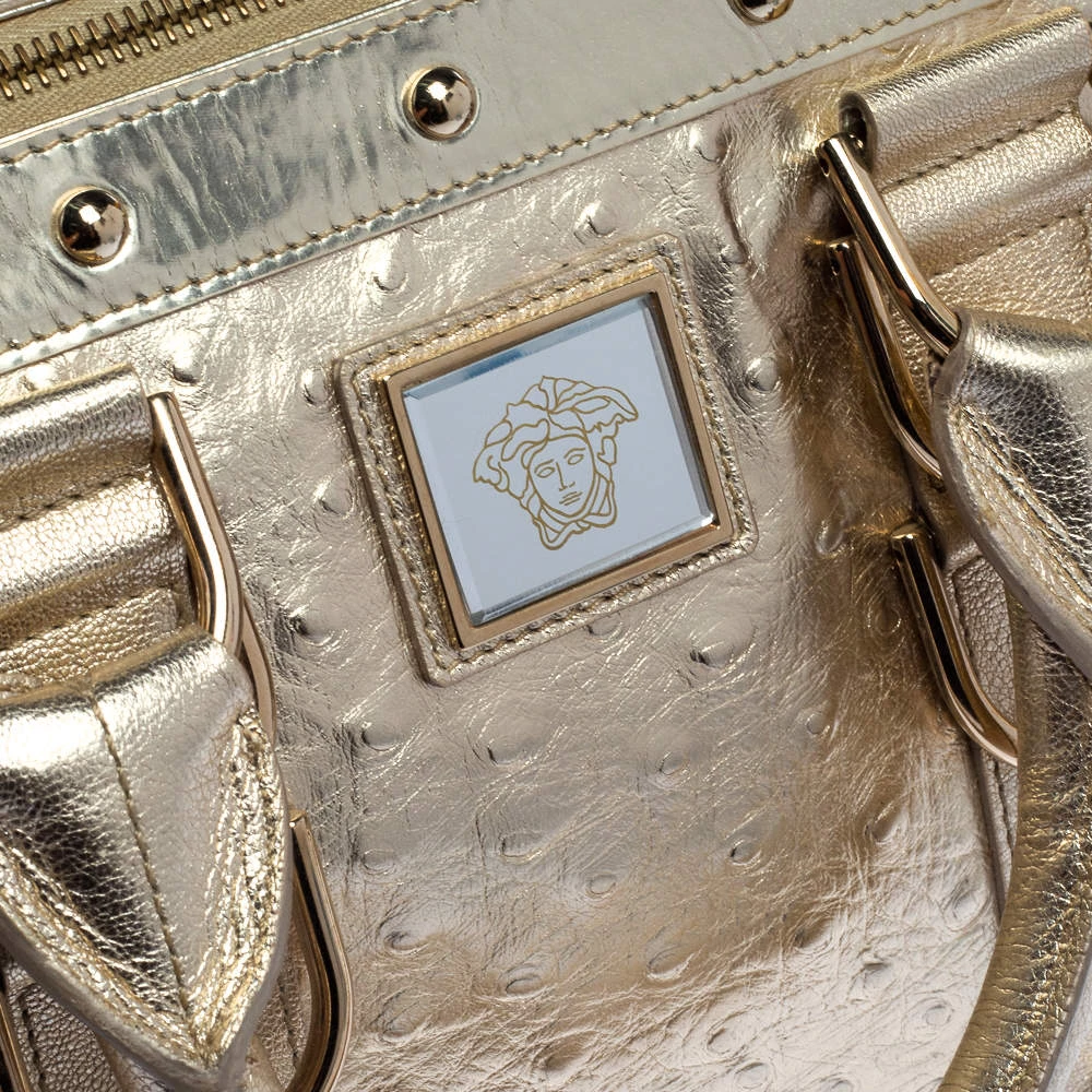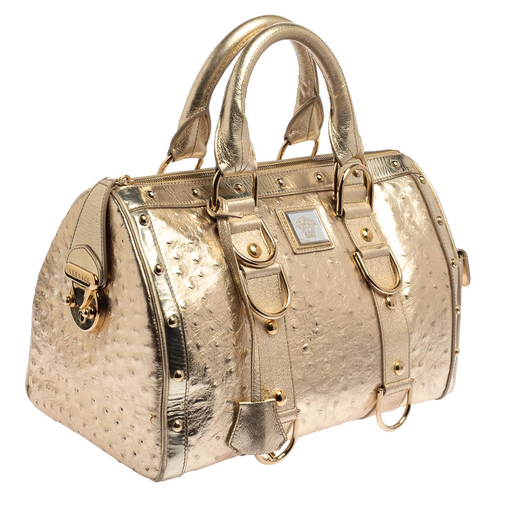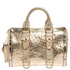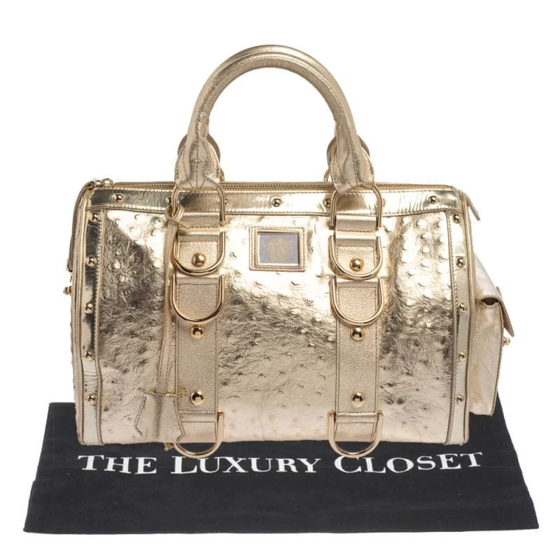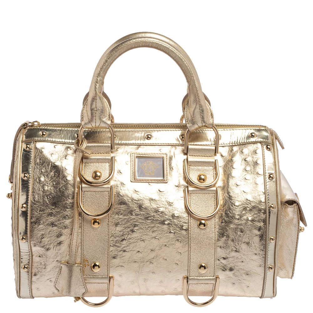 How gorgeous is this satchel from Versace! It carries an outstanding design and a fabulous interplay of ostrich-embossed leather and gold-tone hardware. It has a top leading to a satin interior while being held by two top handles. The shape and the brand logo on the front just uplift its beauty and makes it a buy you will not regret.