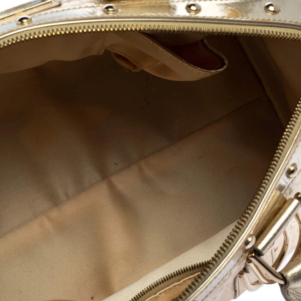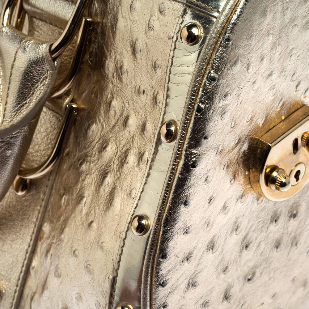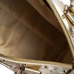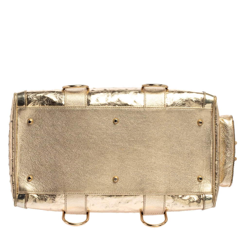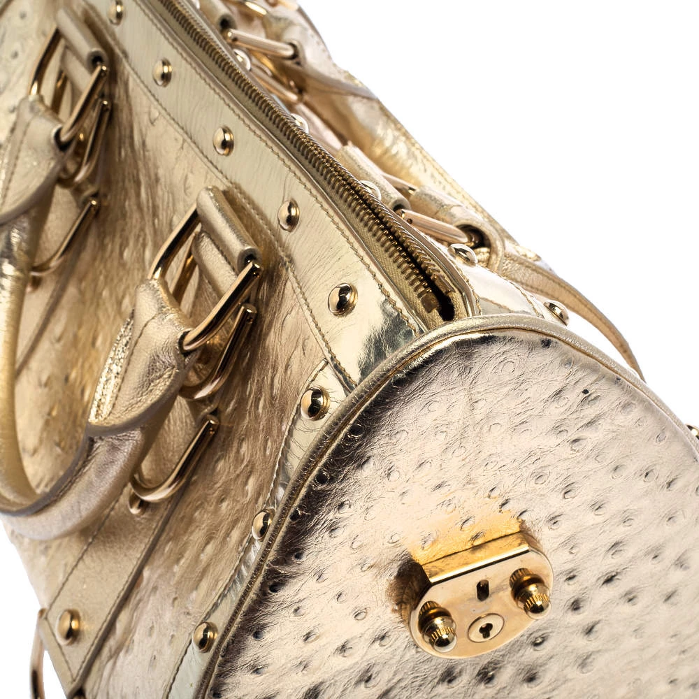 How gorgeous is this satchel from Versace! It carries an outstanding design and a fabulous interplay of ostrich-embossed leather and gold-tone hardware. It has a top leading to a satin interior while being held by two top handles. The shape and the brand logo on the front just uplift its beauty and makes it a buy you will not regret.