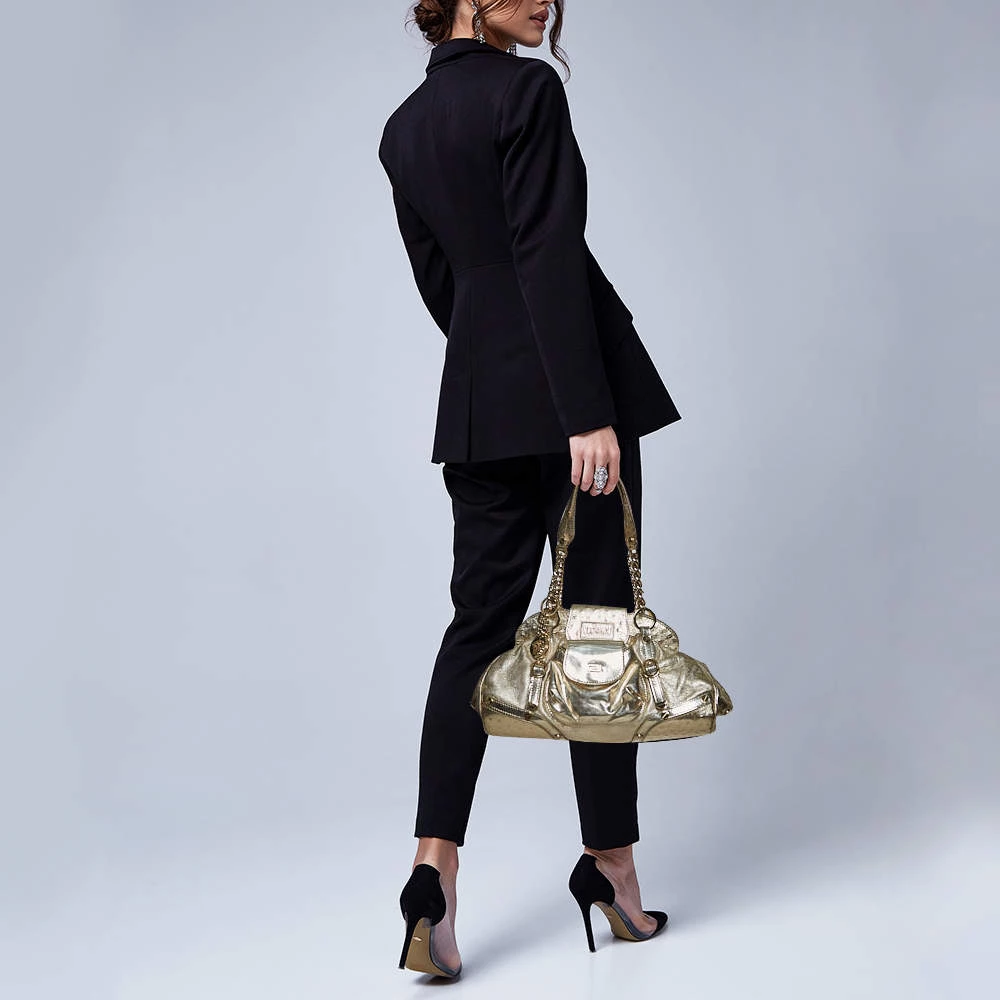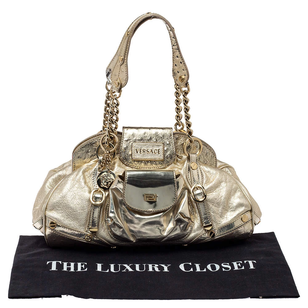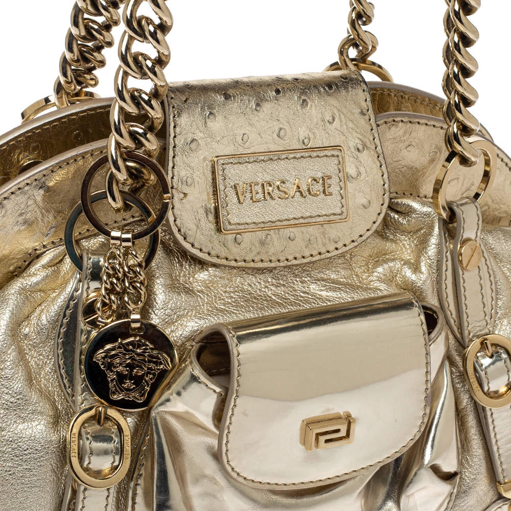 Stunning in appeal and high on style, this satchel from Versace has been crafted from patent leather and styled with gold-tone hardware and ostrich embossing. It comes with dual top handles of chains and leather rests. The interior is satin-lined and sized to hold your essentials.