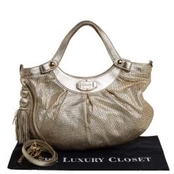 This gorgeous bag by Versace is glamorous. Crafted in Italy, it is made from perforated leather and comes in a lovely shade of gold. This shoulder bag features the signature logo & a tassel detail on the side. The bag opens to reveal a satin interior with enough space for essentials. It has dual handles and a shoulder strap.
