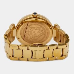 This Mystique women’s wristwatch by Versace has a gold-plated stainless steel bracelet and case that lends durability without compromising on glamour. The round bezel surrounds a lovely dial with dual hands. The dial is further beautified with a stunning hibiscus pattern that adds femininity and color. The case back mirrors the dial’s motifs. The creation runs on a quartz movement for accurate timekeeping.