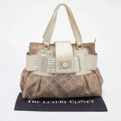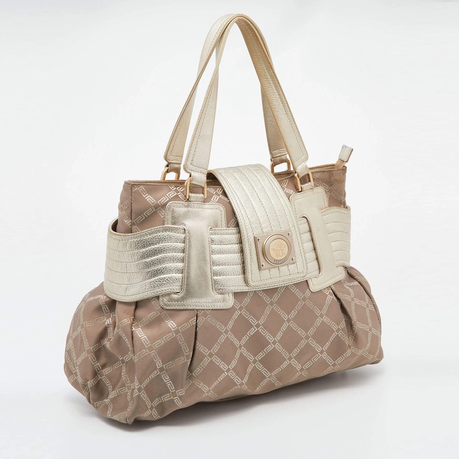 This Versace satchel is a symbol of style and reliability. This gold-colored bag is crafted from signature fabric and leather. It is equipped with a spacious satin interior, two handles, and the Medusa head on the front.