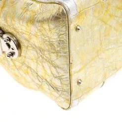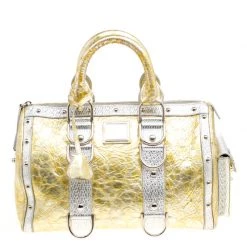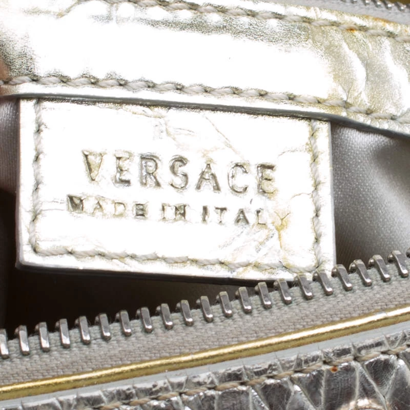 This bold and eye-catching Versace Snap Out Of it satchel is sure to make heads turn. Crafted from ceramic effect leather the bag is accented with a Gianni Versace Couture plate and silver-tone studded hardware. It features dual top handles and a top closure that opens to a satin lined interior that will hold all your necessities.