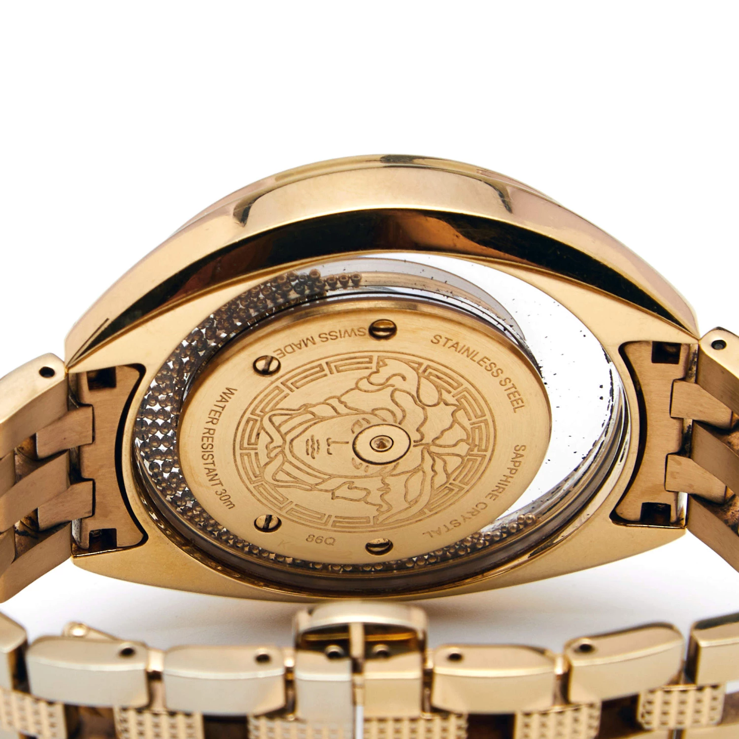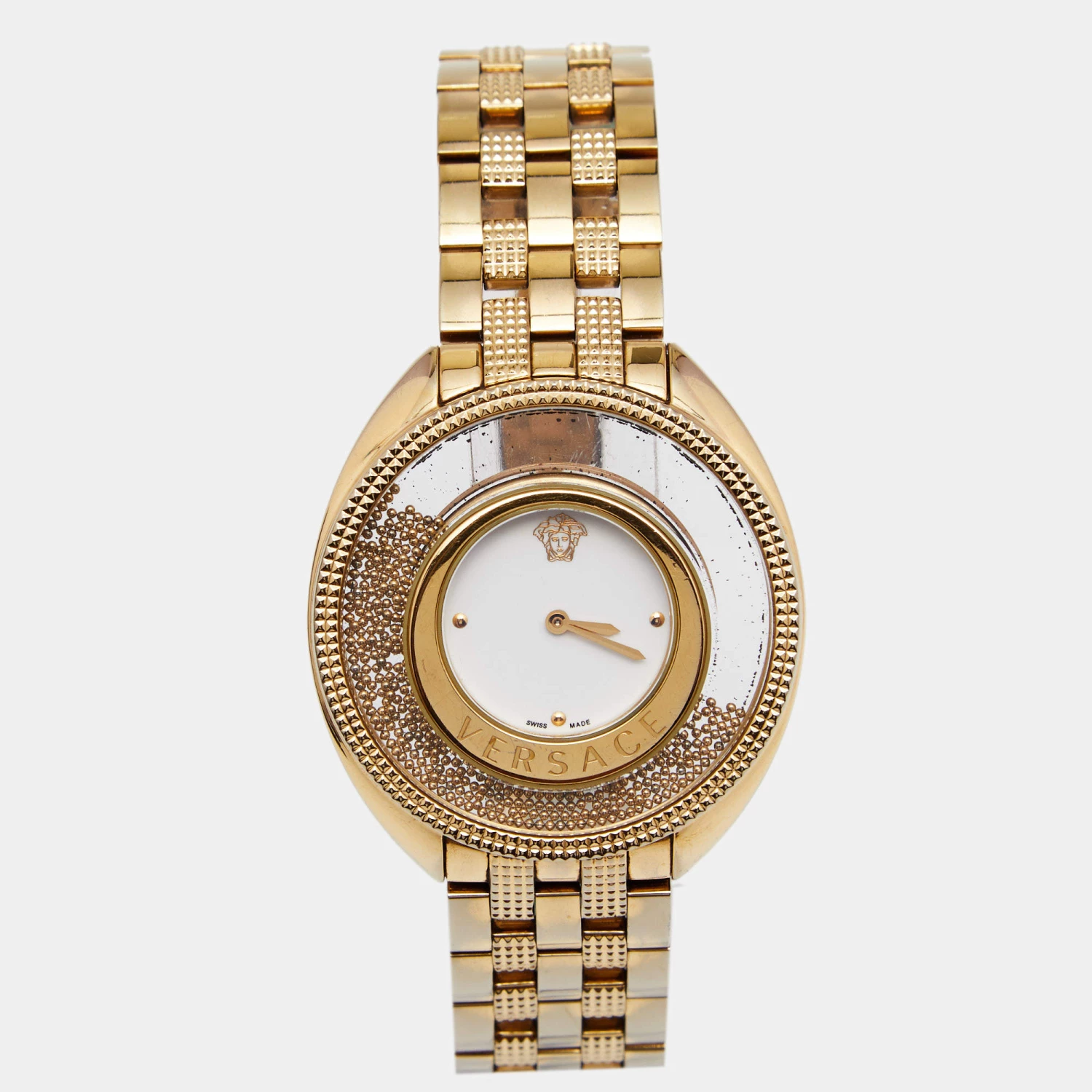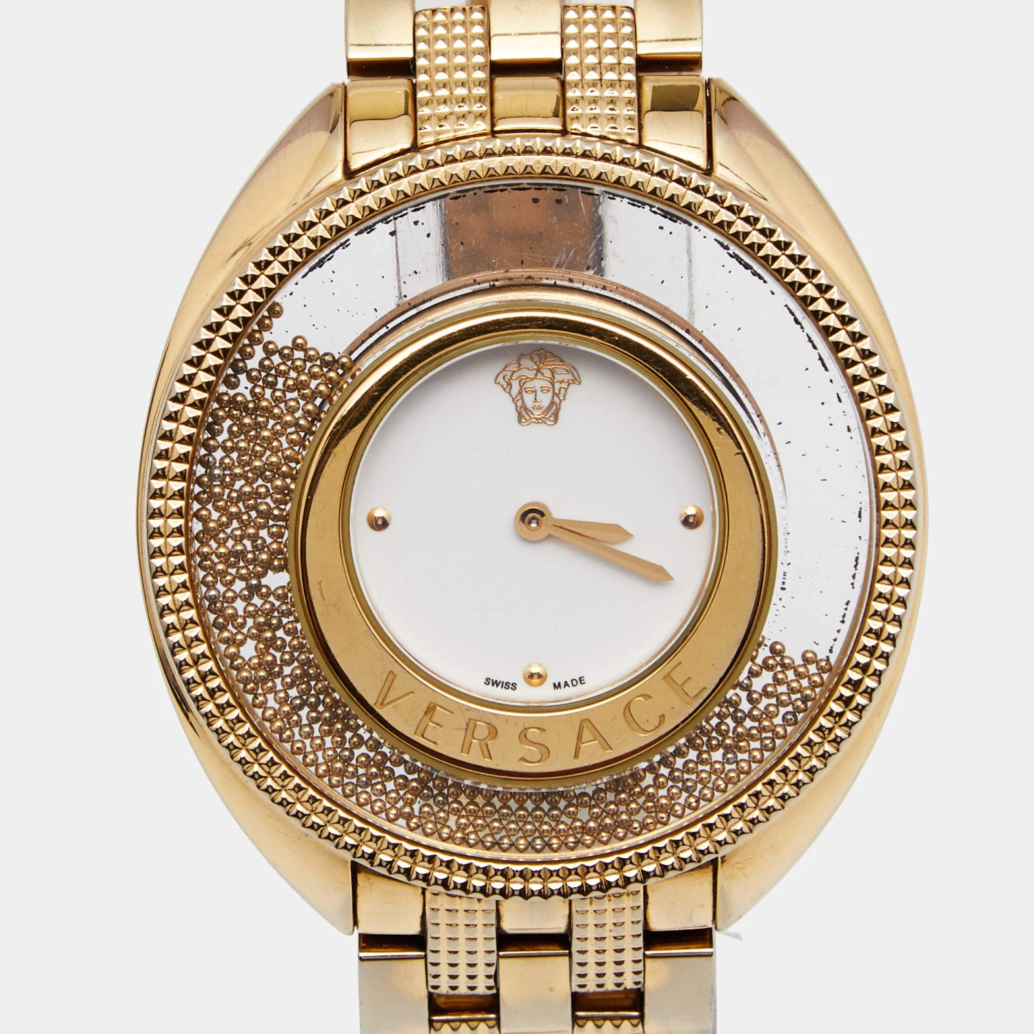 This beautiful timepiece from the house of Versace is sure to be a conversation starter with its eclectic and eye-catching design. Constructed in gold-plated stainless steel, this Destiny Spirit 86Q watch features a transparent panel on the case filled with little gold-tone beads floating as you move.