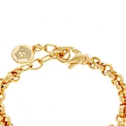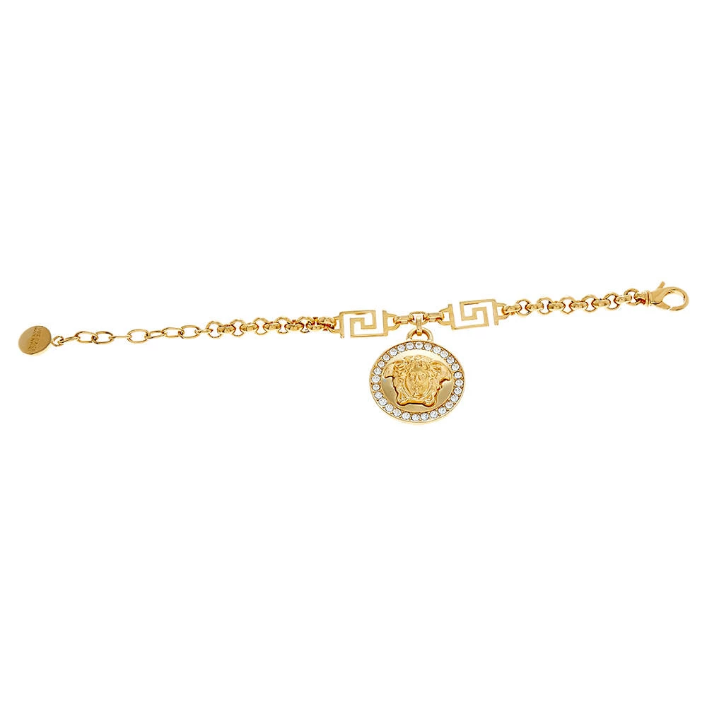 A chunky bracelet from Versace, this gold-tone piece comes with adjustable loops to ensure the perfect fit. The charm that dangles from the piece features the iconic Medusa motif. Studded with crystals for a luxe finish, it is secured by a lobster clasp.