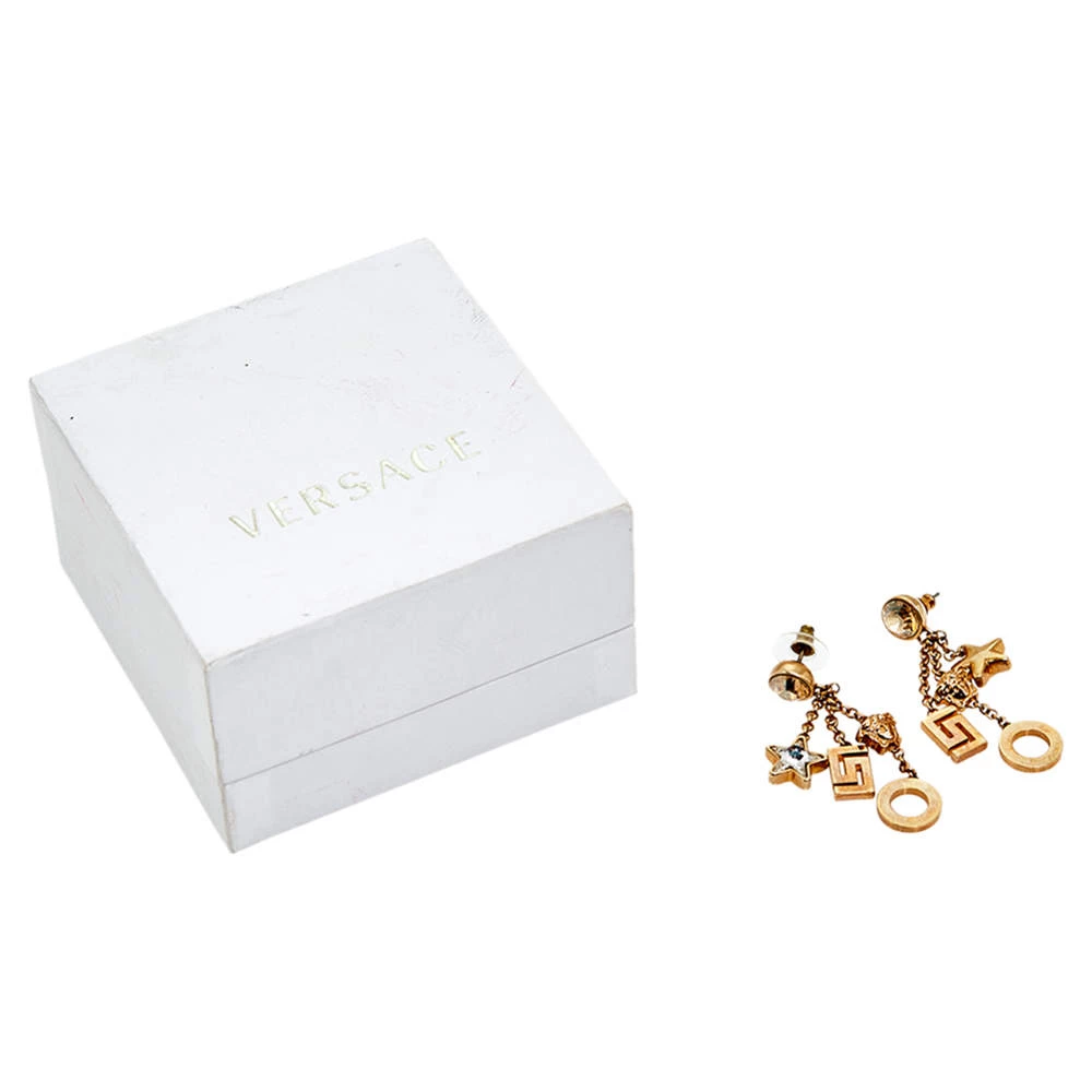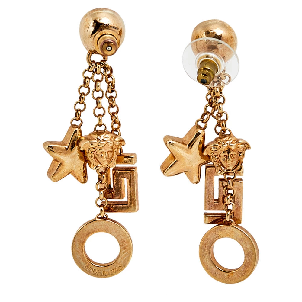 Add some shine and shimmer to your outfit with this pair of Versace earrings. Made from gold-tone metal, their dangling design features signature motifs as charms. Pair them up with their matching ring and pendant for a cute and casual look.