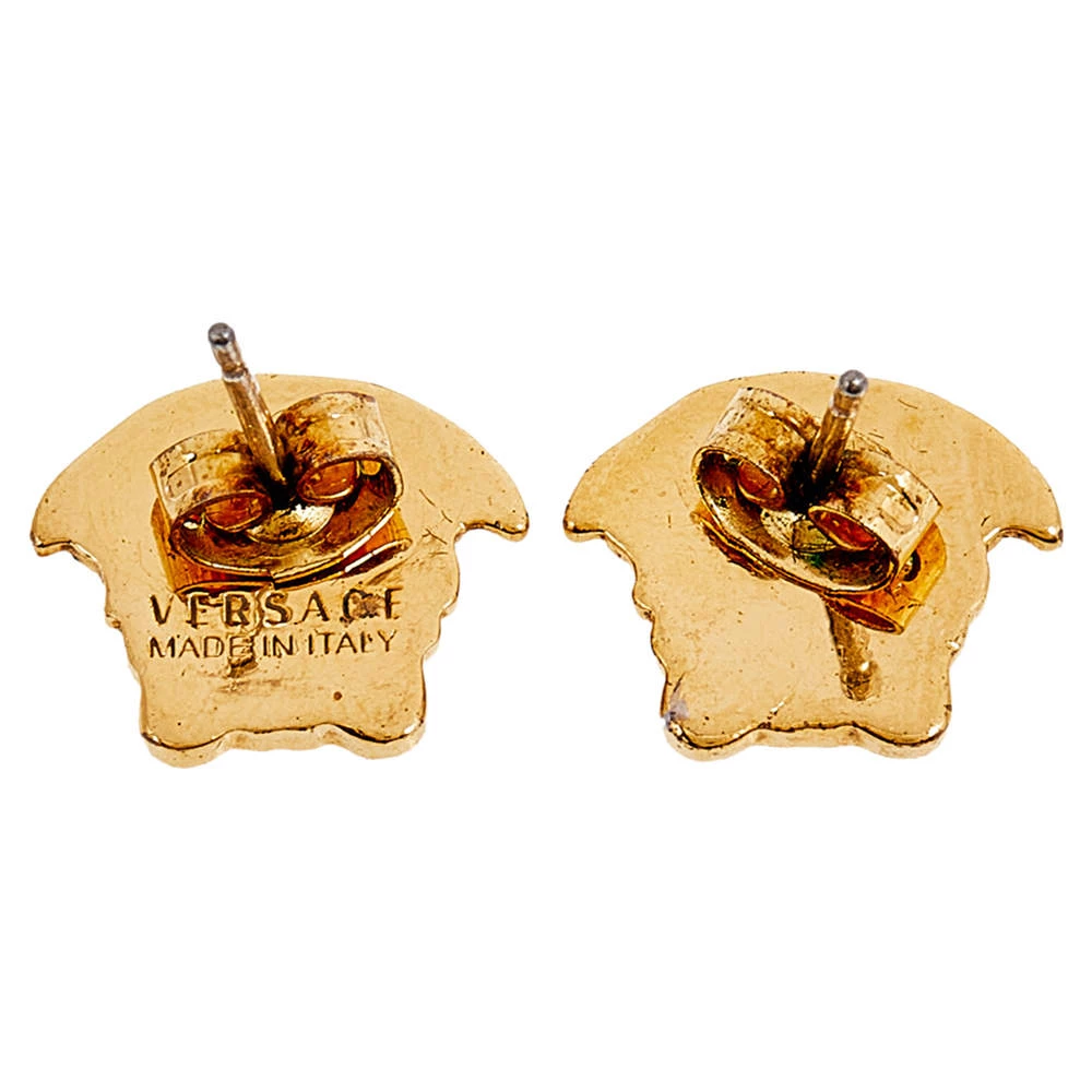 Elegantly crafted from gold-tone metal, this pair of stud earrings from Versace features their iconic Medusa motif. Beautifully designed, this pair is ideal to be worn on all kinds of occasions. This pair is secured by push-back closure.