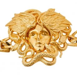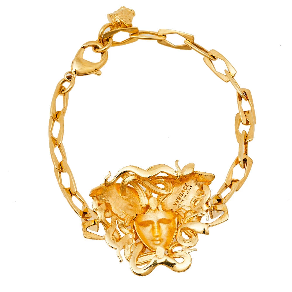 A bracelet from Versace, this gold-tone piece comes with adjustable loops to ensure the perfect fit. The charm that highlights the piece features the iconic Medusa motif designed with wings and a serpent. Exuding a luxe finish, it is secured by a lobster clasp.