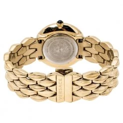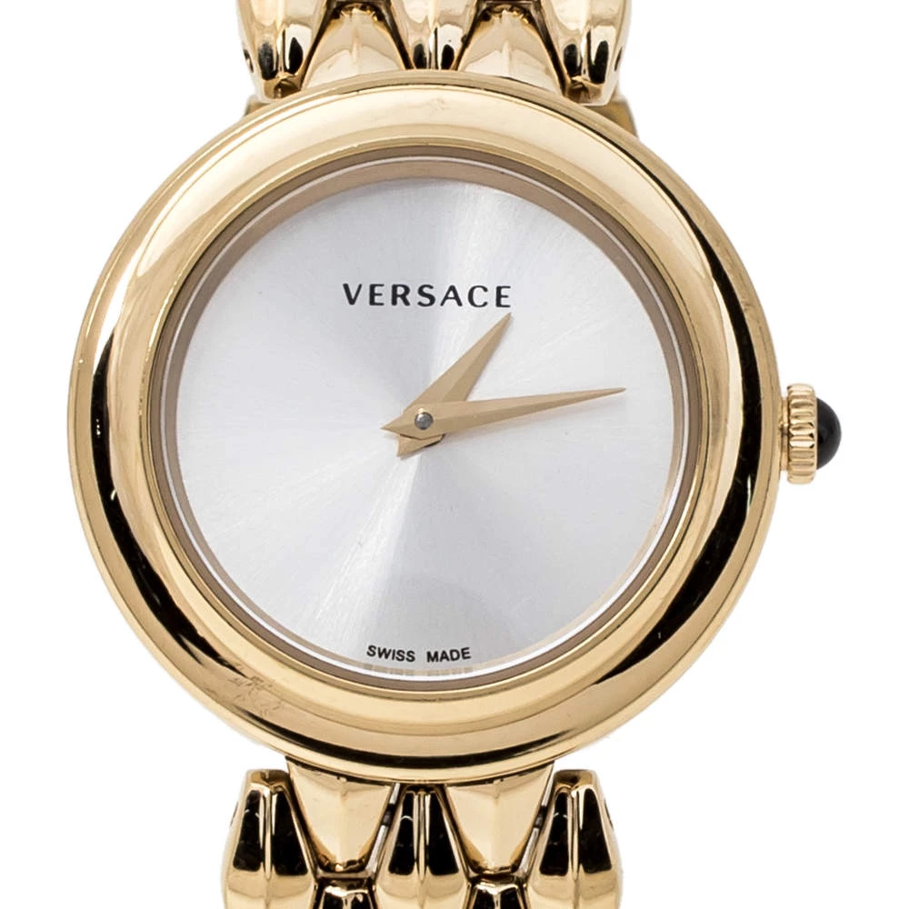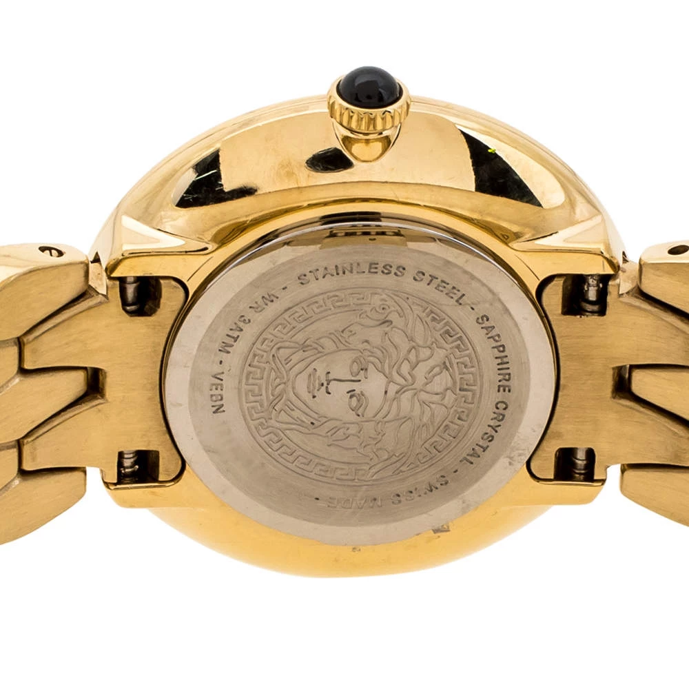 Your unique style deserves a luxurious touch like this V-Flare VEBN timepiece from Versace. Its gold-tone stainless steel case has a diameter of 28 mm and a smooth bezel. The dial features two petite hands and the brand name and the quartz watch is complete with an interlocking gold-tone stainless steel bracelet that fastens with the help of a push-button deployment clasp. Equipped with a water resistance of 30 meters, this stunner will look perfect on the wrist of a watch lover like you!