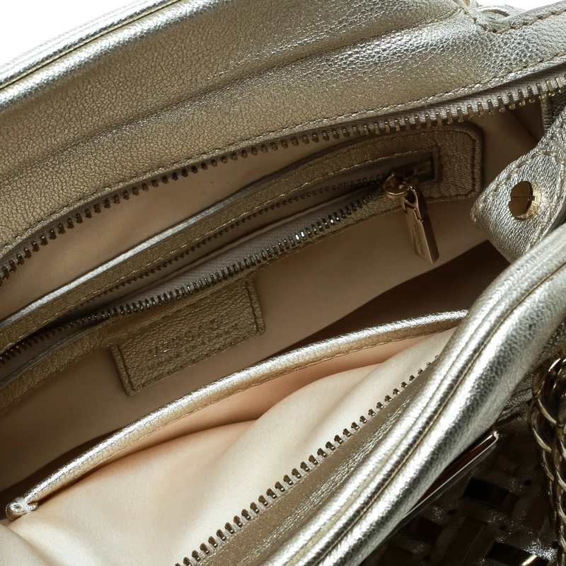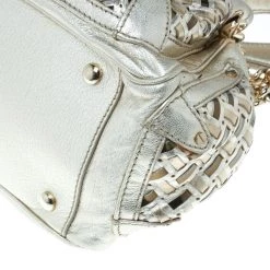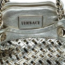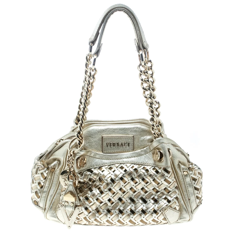 Flaunt this Versace satchel with any style for any occasion. Designed in a gold woven leather, this satchel features stitched detailing and the brand details along with a slip pocket on the front. It comes with chain-link shoulders having leather shoulder rests and is accented with gold-tone hardware. The top zip closure opens to a satin-lined interior featuring one sip and one slip pocket. This satchel is undoubtedly a total eye-catching piece!