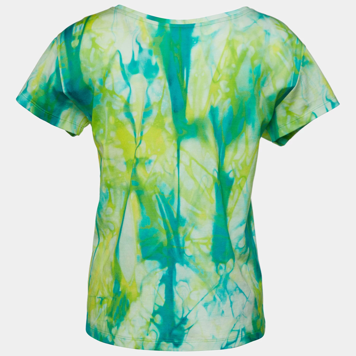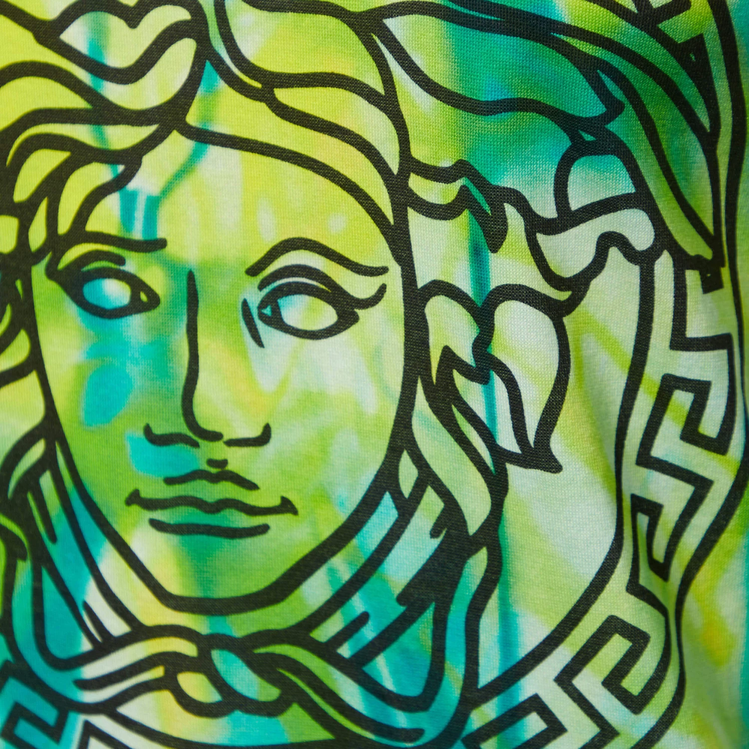 This T-shirt from the House of Versace is here to make you look fashionable. It is tailored using green jersey fabric, which is enhanced with tie-dye detailing. It showcases a Medusa print on the front and short sleeves. Wear this Versace T-shirt with pants or denim for casual outings.
