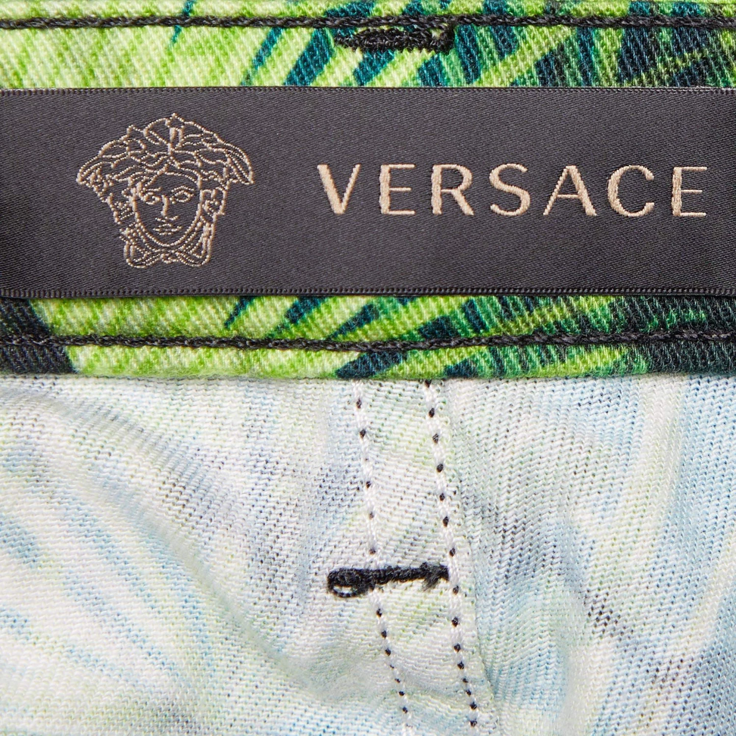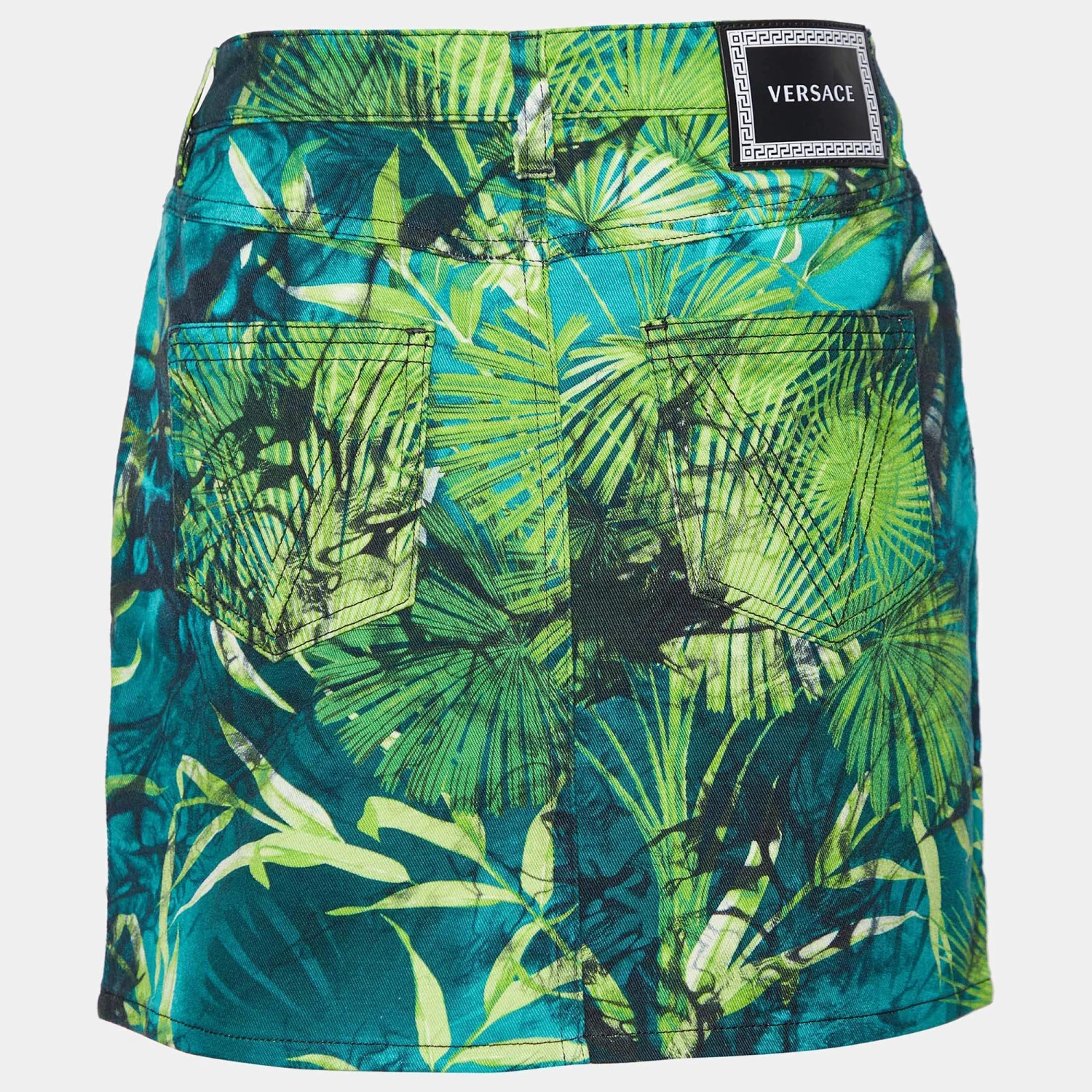 Infuse color into your summer attire with this beautiful mini skirt from Versace. Accented with jungle prints, this skirt is fashioned in green denim and flaunts a Medusa-motif button on the front. It has a zipper fastening and five pockets. Match it with a white lacy blouse and a clutch bag for a brunch date with your girlfriends.