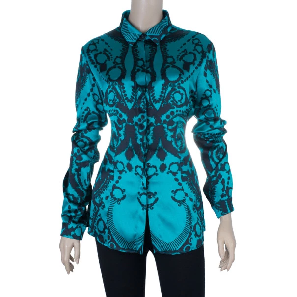 Sport this Versace pixel printed silk shirt at work or on a night out and wow everyone around you! Pair it with a black pencil skirt for a fabulous look. It features long sleeves, a gorgeous black print contrasting the green canvas, a classic collar and 100% silk material so that it’s light and flowy on your skin!Original Retail Price: US $995