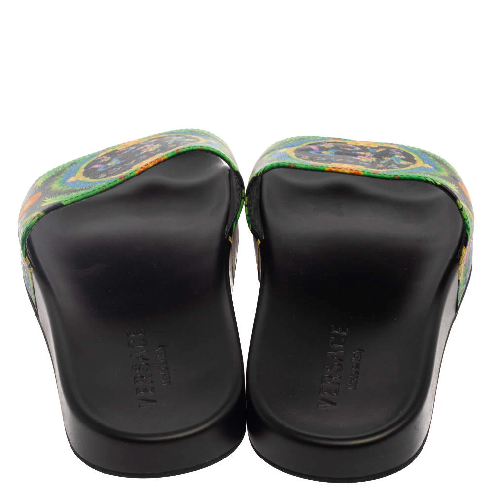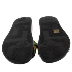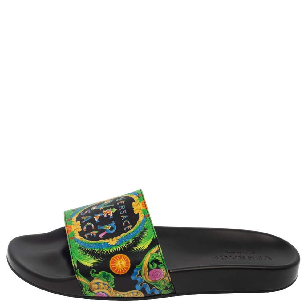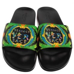 Perfectly blending comfort and style, these slide sandals from Versace need to be owned by you! They are crafted from leather in an open toe silhouette and styled with vibrant green logo printed vamp straps. They are equipped with comfortable rubber insoles and durable outsoles.