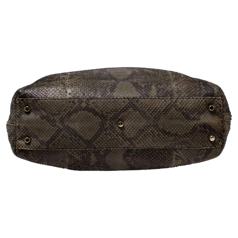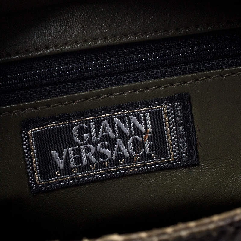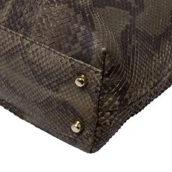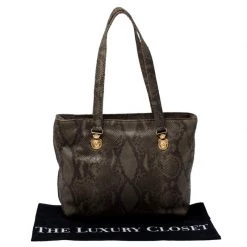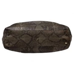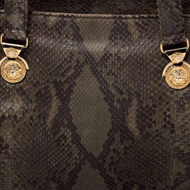 Highly durable and extremely fashionable, this tote is from Versace. The bag comes made from python leather in a luxurious green shade and designed with their signature Medusa motifs. Further, it is equipped with dual handles and a spacious interior that is secured by a zip top closure.