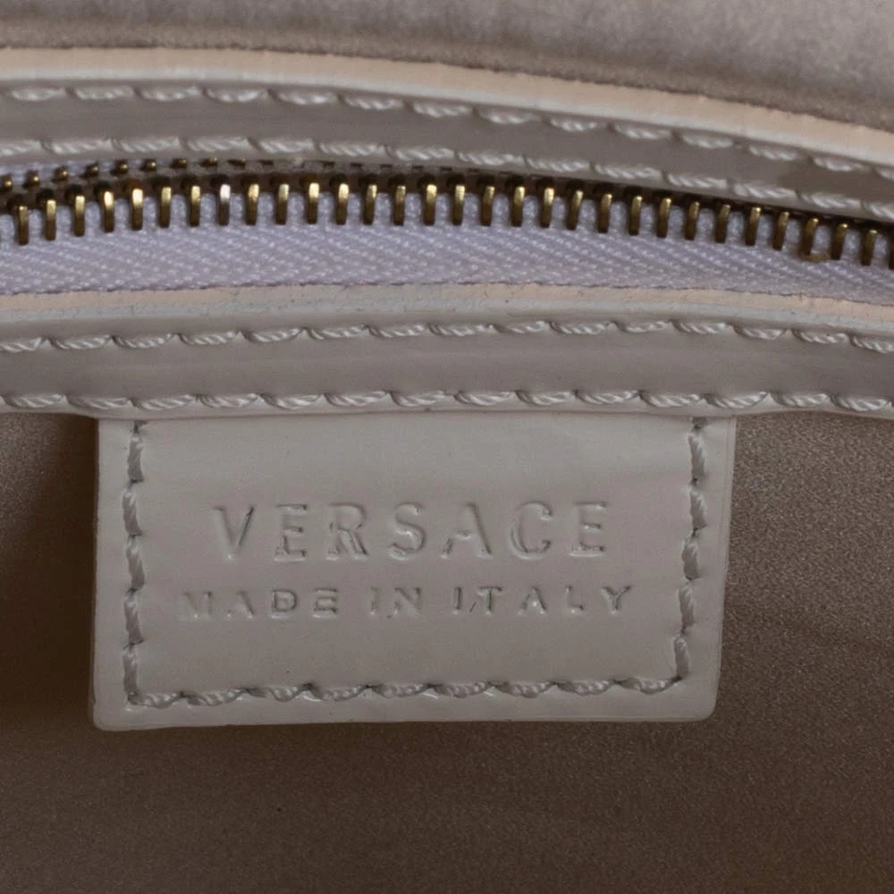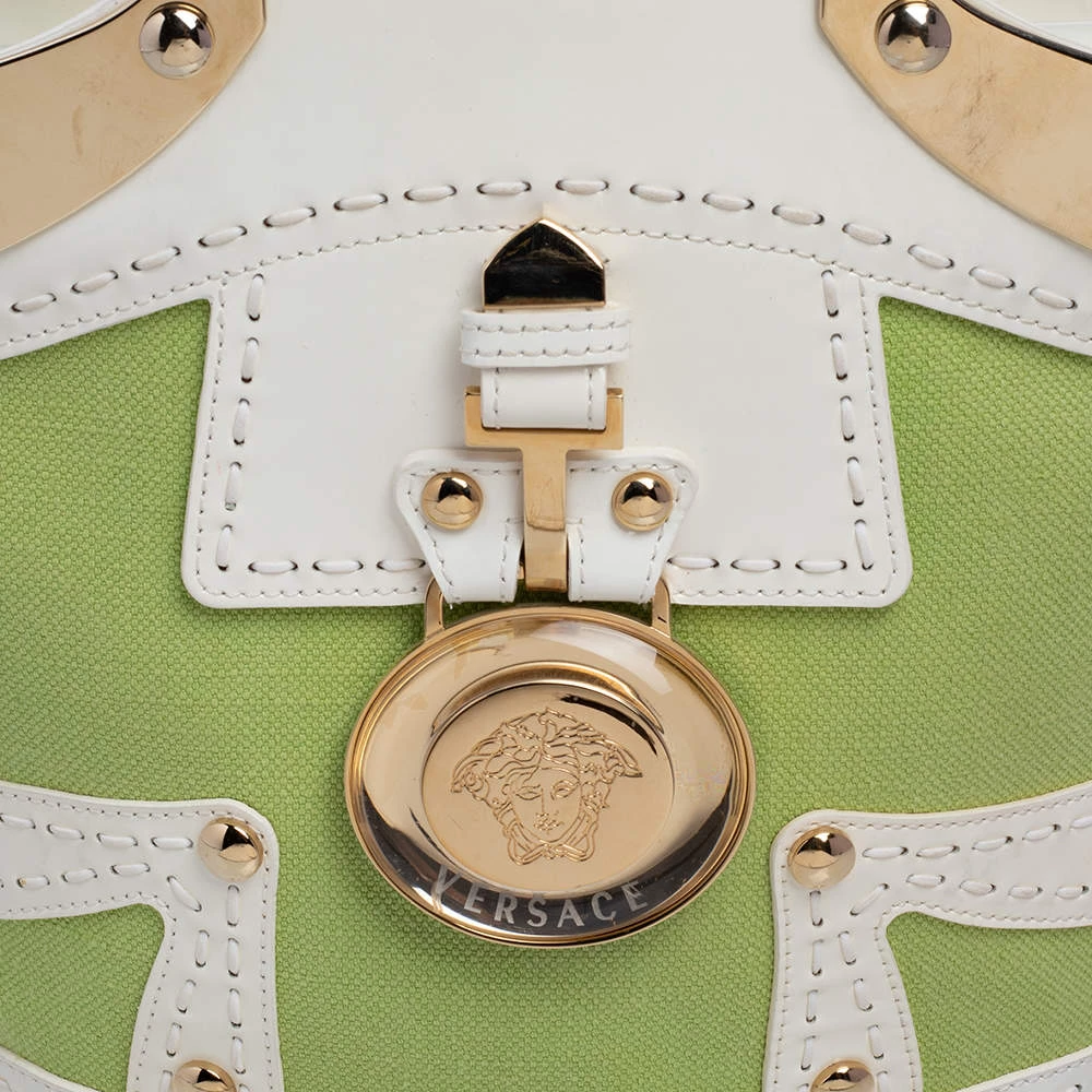 Attain a chic look when you carry this Versace tote in style. Crafted from green canvas and trimmed with patent leather as well as gold-tone metal, the bag is held by dual handles and is equipped with a spacious leather-lined interior. The creation features a Medusa-detailed padlock at the front.