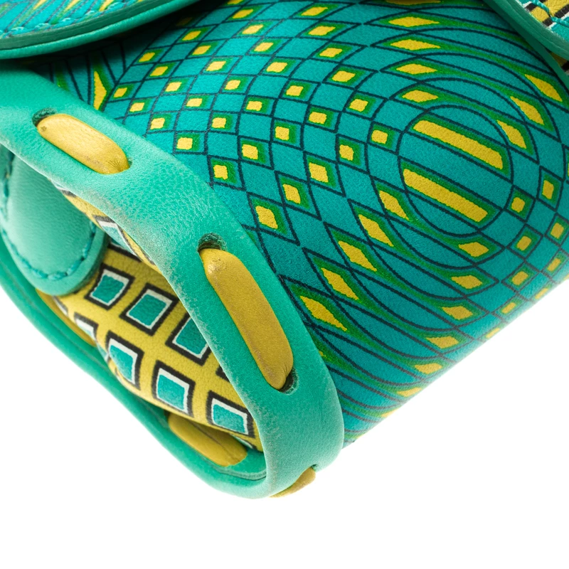 A perfect day and night wear party bag, this Versace crossbody piece is colourful and stylish which makes it a versatile piece to own. Crafted in green and yellow printed leather, this bag features a front flap with a silver tones buckle and strap detail to add a casual chic and modern vibe to its look. The green leather and chain link strap sits perfectly on your shoulders and even fits crossbody.