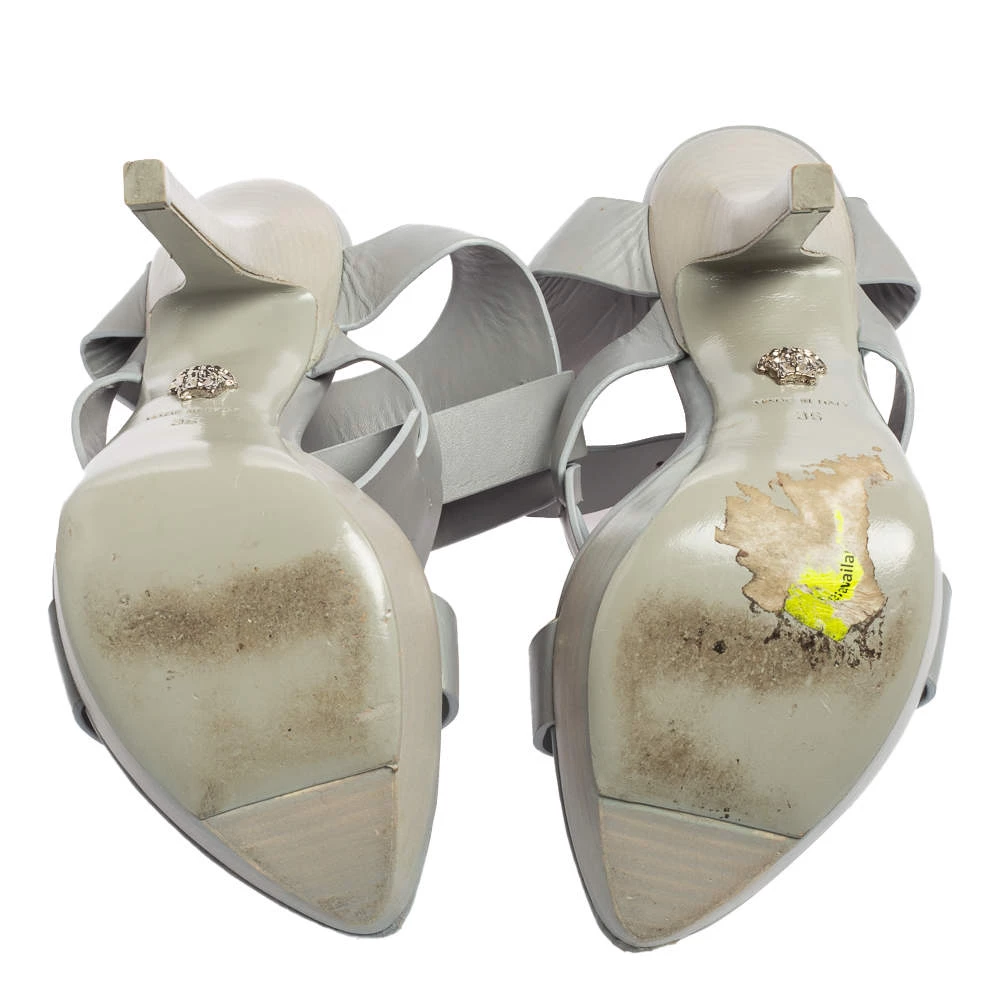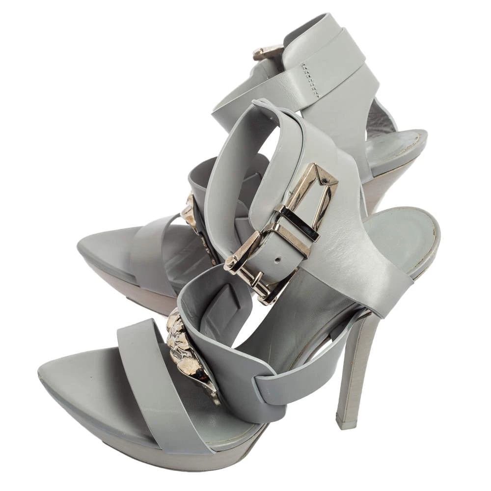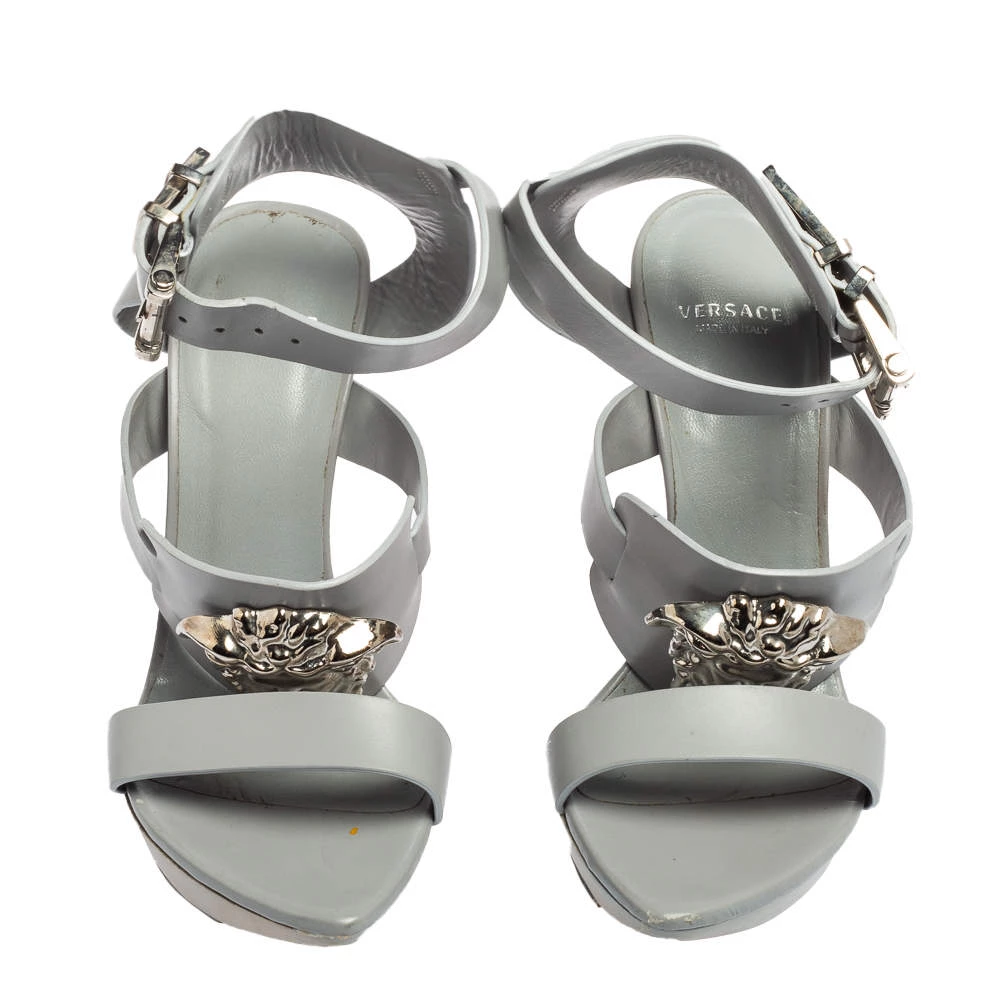 Define your feet with these pre-owned Versace sandals. The shoes are made of grey leather with open toes, Medusa motifs, and ankle buckle closure. Slim heels complement the design beautifully.